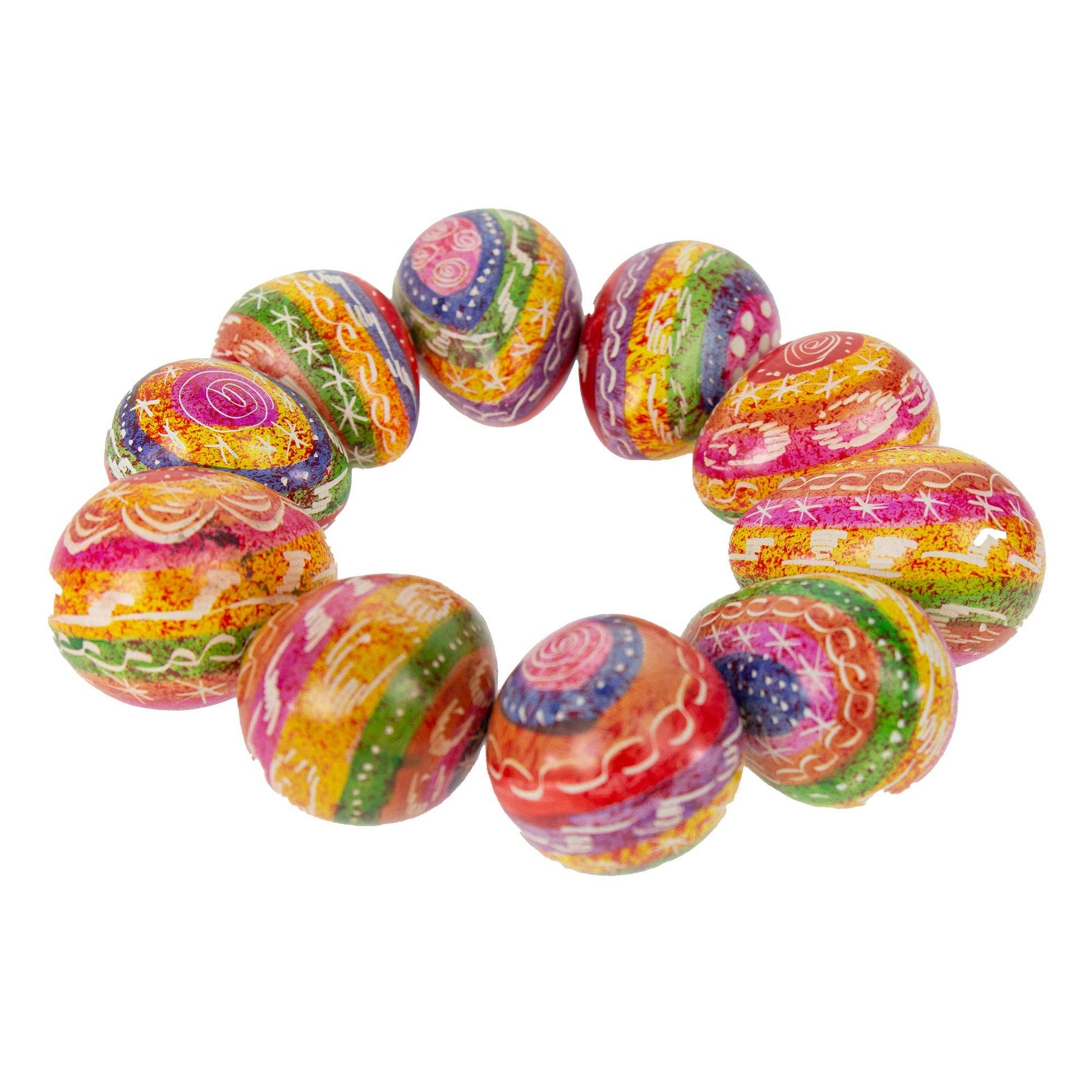 Hand-carved from a single piece of Kisii soapstone by African artisans, each colorful egg is uniquely handmade. The artists paint a range of colorful and cheerful patterns. The whimsical eggs are beautiful displayed in a bowl, glass vase, on a table. Adorable for Easter-time and year round. Each Measures approximately 2 inches long.