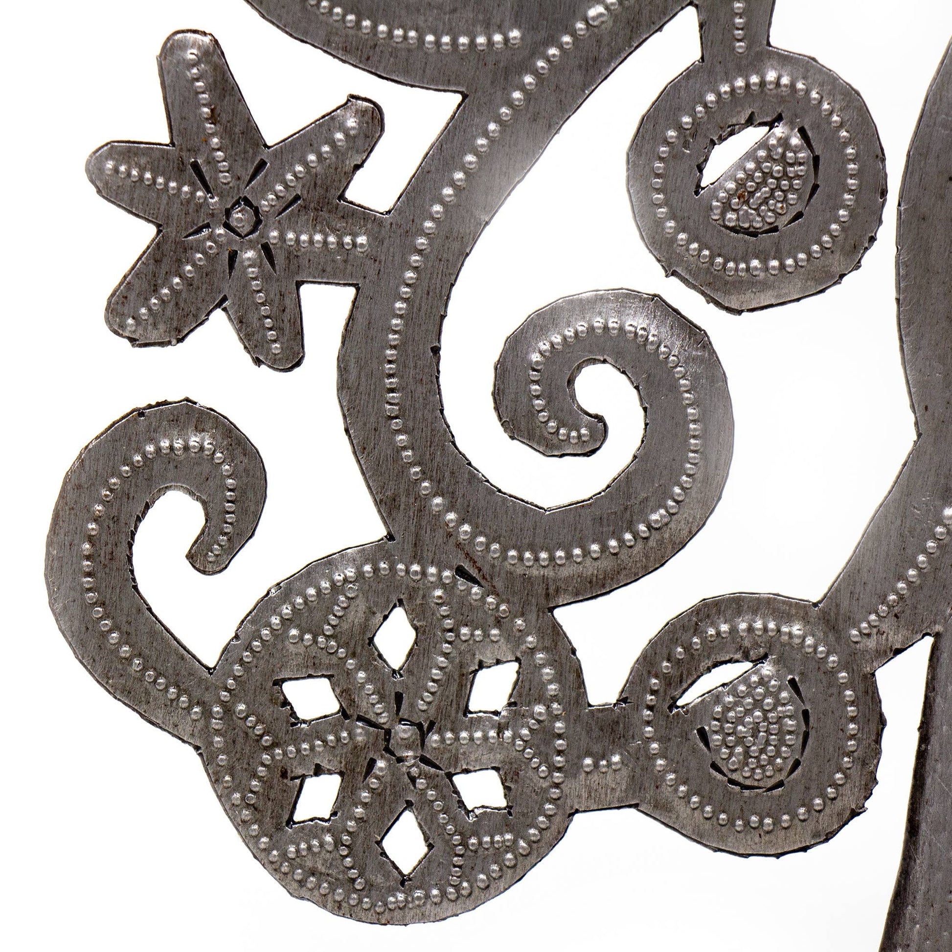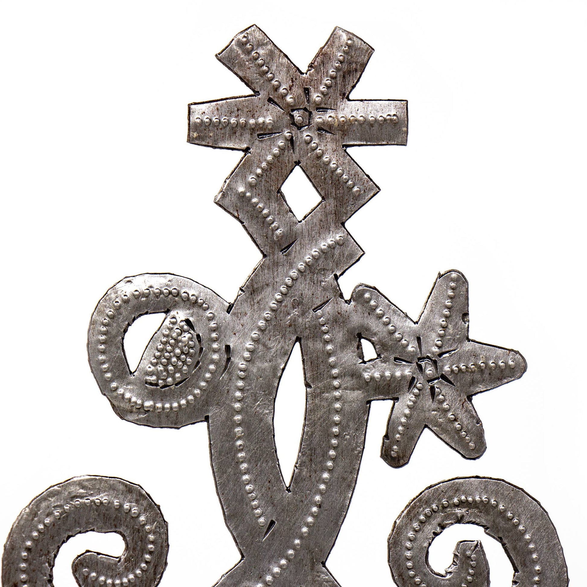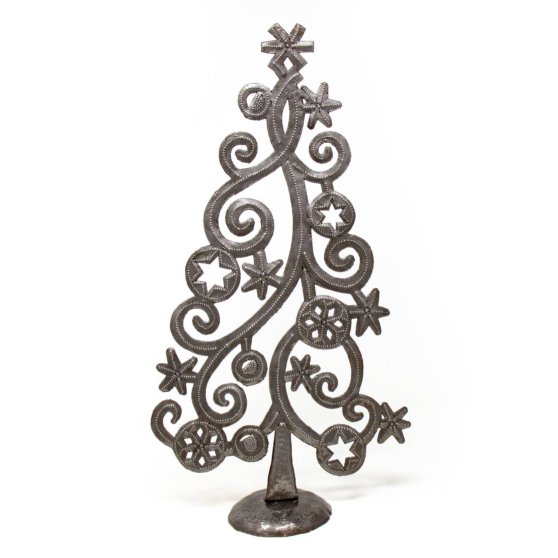 This 14" x 7.5" Christmas tree is crafted from Haitian steel drums and expertly embossed with stars and snowflakes in a swirling design. An artistic tabletop decor, it's hand-cut by local artisans.