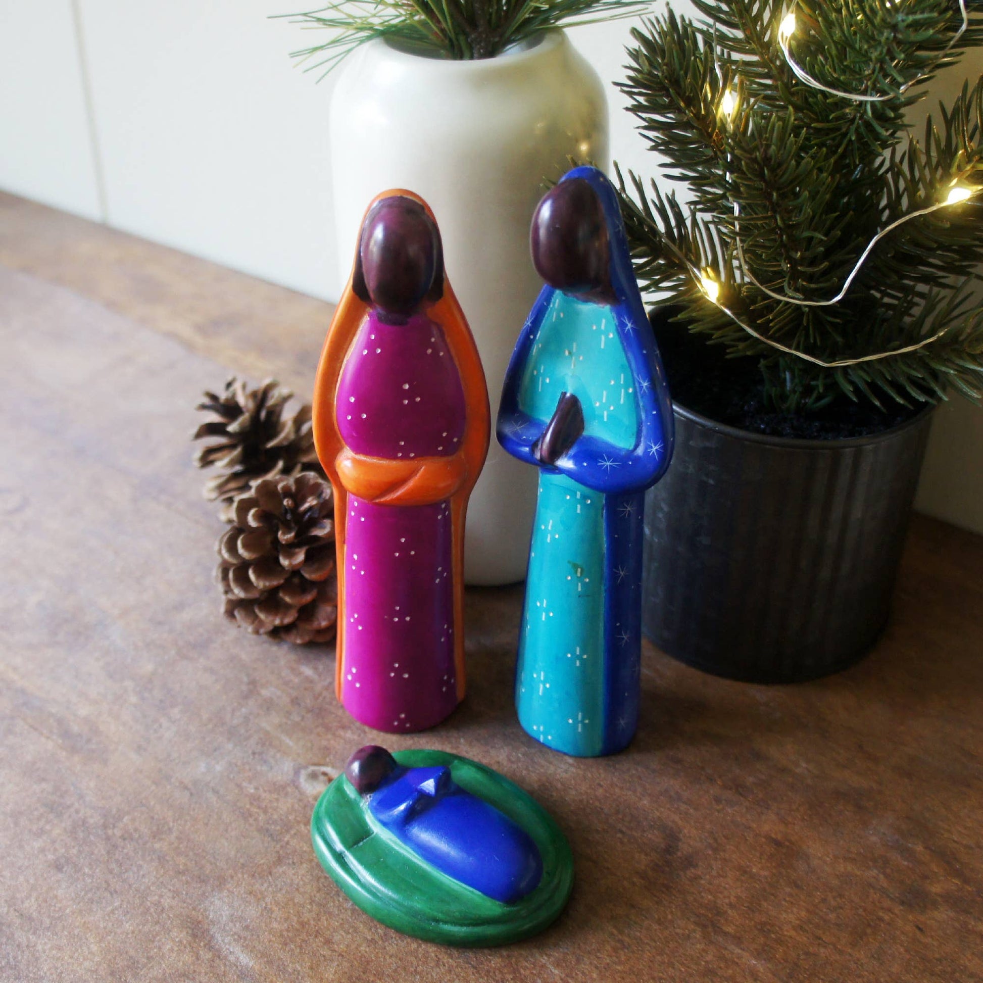 This colorful nativity is a fair trade product handmade in Kenya. The pieces were hand carved out of stone, sanded until smooth, then painted, and etched. Mary and Joseph are approximately 6 inches tall.