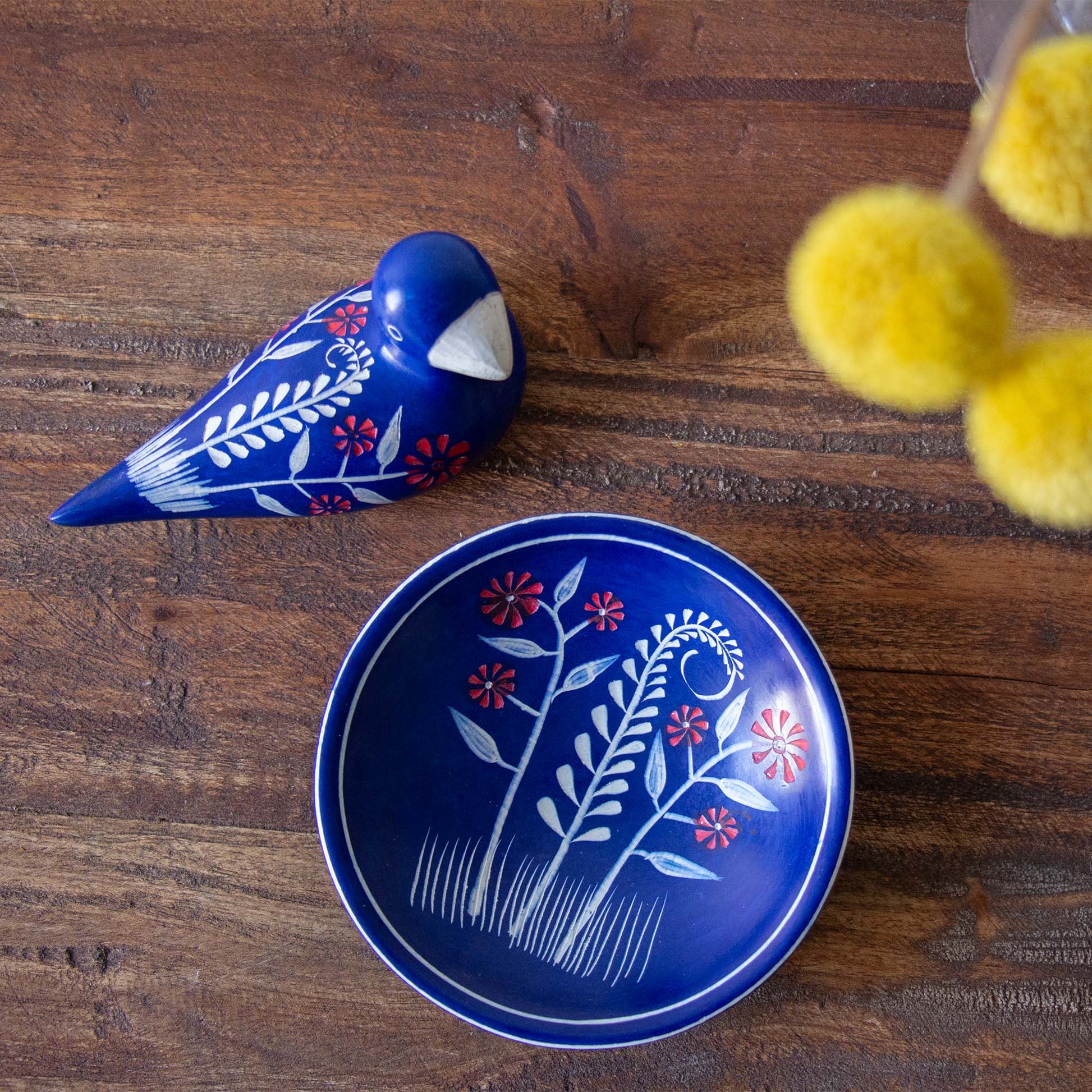 Hand-carved from a single piece of Kisii soapstone by African artisans, each dish is uniquely handmade. The artist painted beautiful red flowers on a blue background, The stems, vines, and grass are etched artistically into the dish. Perfect dish for jewelry or other small items.