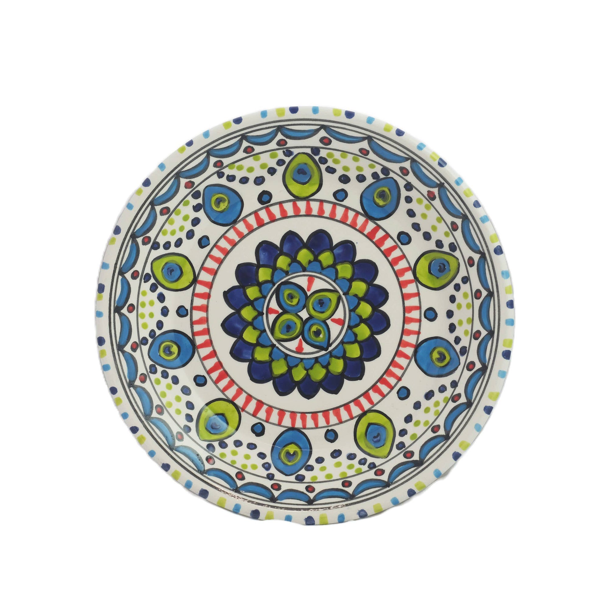 This exquisite dinner plate features colorful mandala-like patterns and bold stripes, meticulously hand-painted by artisans at the Tunisian with a desire to bring their vibrant designs to American markets. Each plate is crafted with care, ensuring a unique and high-quality piece. Perfect for and table settings, this decorative plate adds a touch of elegance and artistic flair to any meal. The food-safe paint and glaze ensure it is safe for all your culinary creations, while its microwave and dishwasher-safe properties make it practical for everyday use.