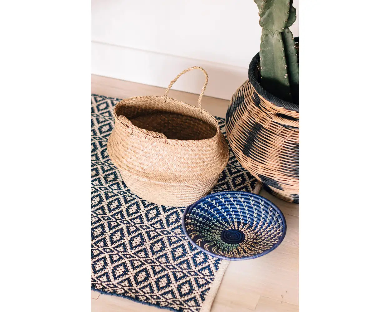 Spirals of blue take flight in shades of blue and natural colored raffia. Sky Flight basket is handcrafted in Uganda. The interior fiber forming the core of each coil is banana fiber, around which raffia palm is wrapped. With each wrapping, the fiber is threaded through the previous coil to form the basket. Raffia fibers are used in textiles, basket-making, rope-making, garden string, construction and for roofing.