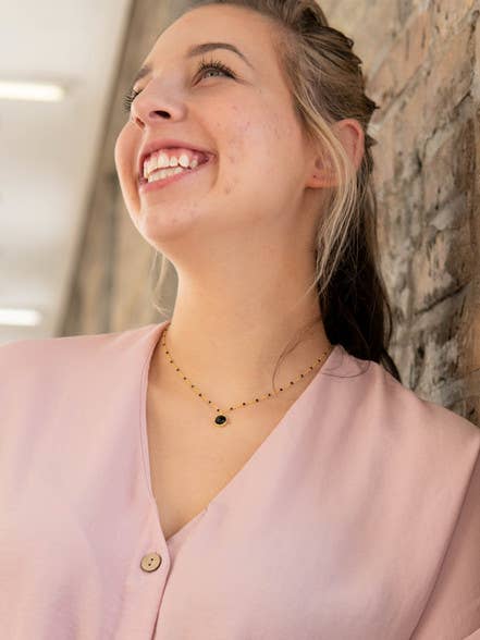 This dainty black beaded gold necklace is the perfect simple necklace to add just a little extra something special to your look. Dainty black beads are interlaced with the recycled brass-plated chain, the small center piece is a slightly larger black bead that adds the perfect amount of charm to this short necklace.