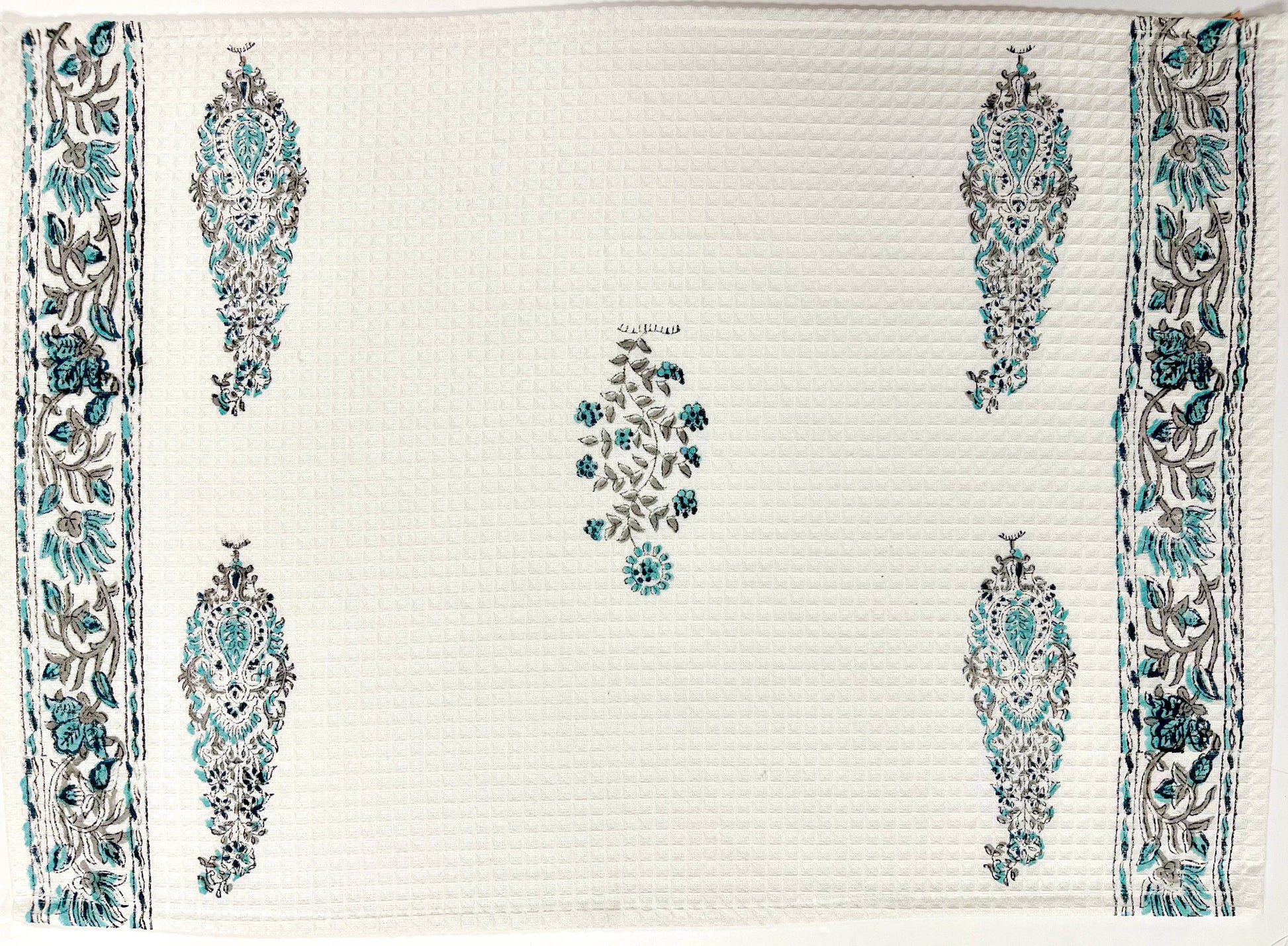 This block-printed towel is a beautiful blend of tradition and texture, made from soft, absorbent cotton. Featuring a waffle texture, it adds a touch of beauty and practicality to your kitchen. It's hand-stamped with intricate block prints, available in a variety of charming patterns and colors.