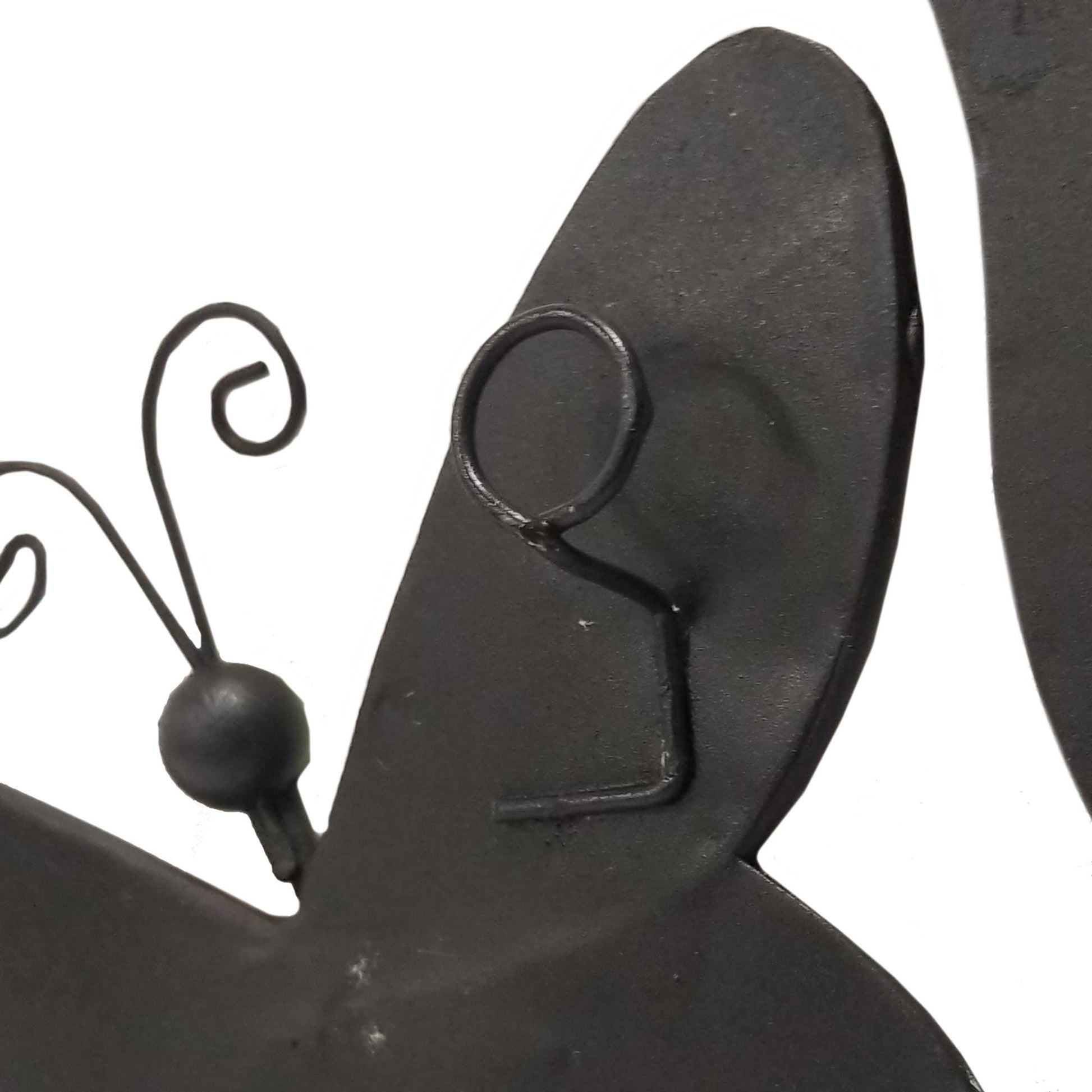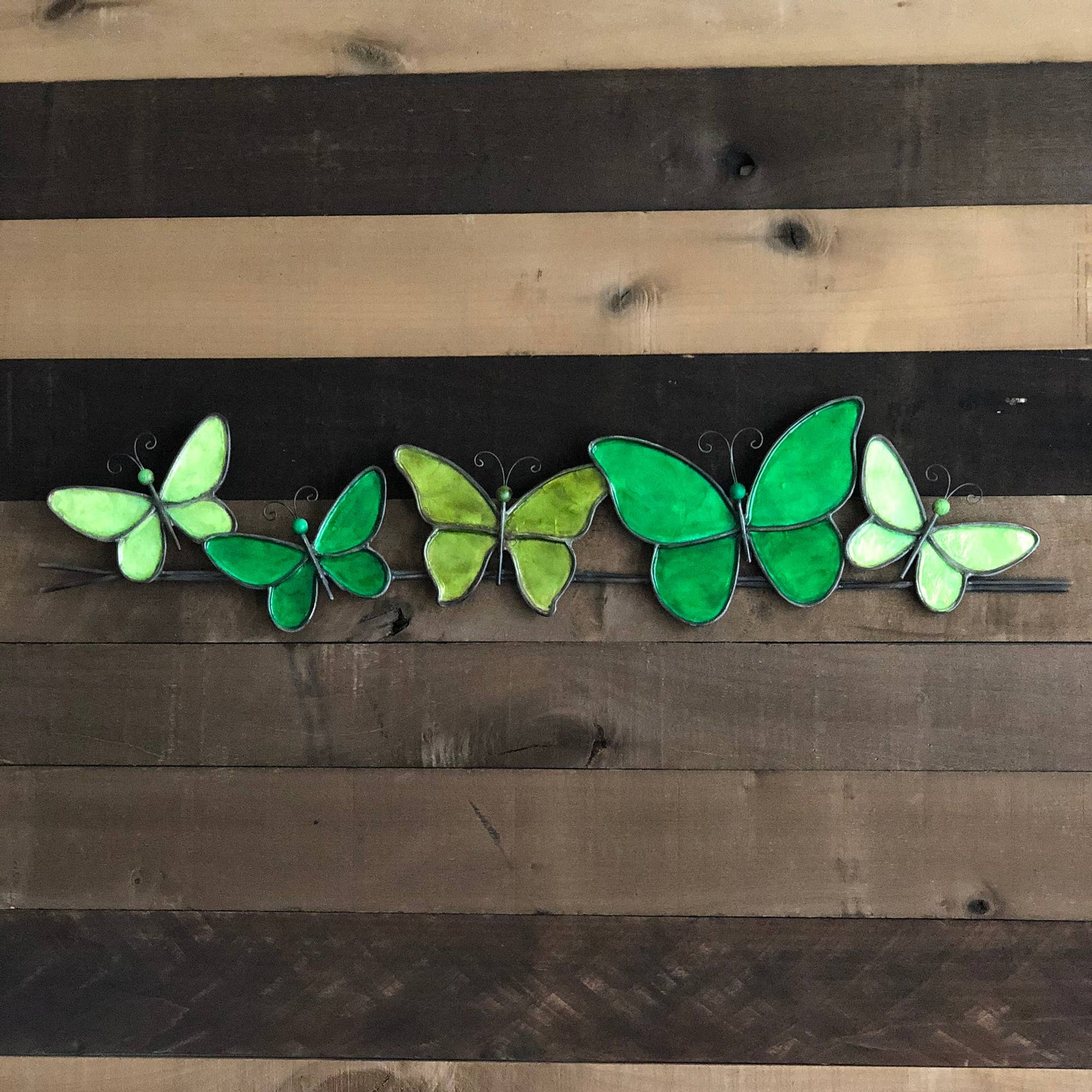 Five, fluttering butterflies are ready to complete their journey after taking a break from a long migration. The slender, metal body of each butterfly connects to colorful capiz-shell wings which catches light and adds shine. Each wing is framed using sturdy wrought iron and reinforced with a metal backing.The basic frame of the butterfly is created using tin, which is powder-coated with a black finish and makes this piece safe to use outdoors. The edges of the frame are reinforced using thicker tin wire. The front of this piece is adorned in areas with capiz shell, an oyster native to the Philippines, before being hand-painted and sealed with a water-based sealant. The primary purpose of this oyster to provide a source of food, however, the shell is a sustainable by-product that can be used for decoration. The capiz shell subtly replicates the reflective qualities of butterflies in nature.