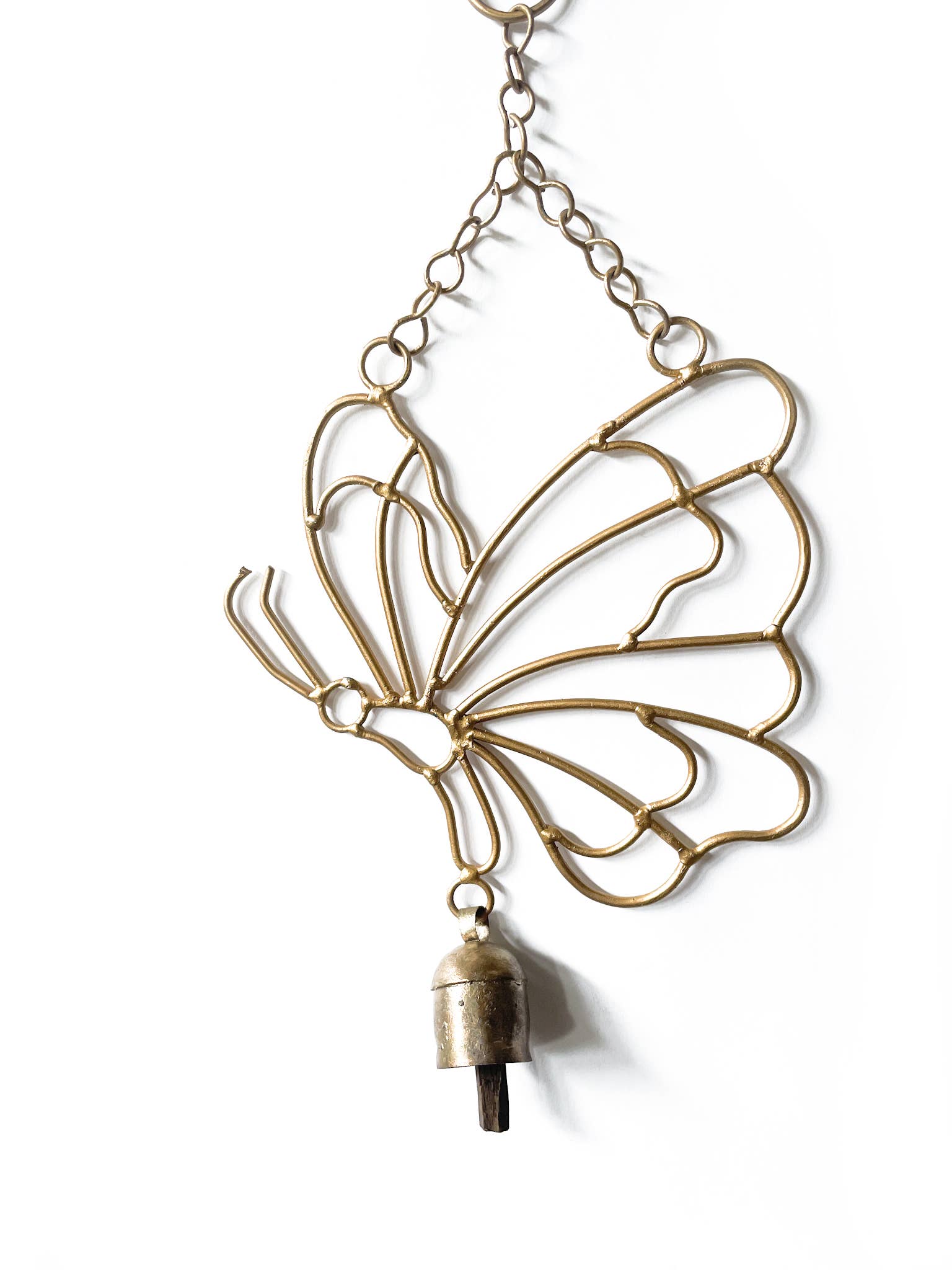 This butterfly wind chime is a stunning and elegant decor piece, featuring a golden butterfly that catches the light beautifully and a mini copper bell attached to the bottom This chime is perfect for adding a touch of grace and whimsy to any space, its gentle tinkling sounds create a serene and calming ambiance.