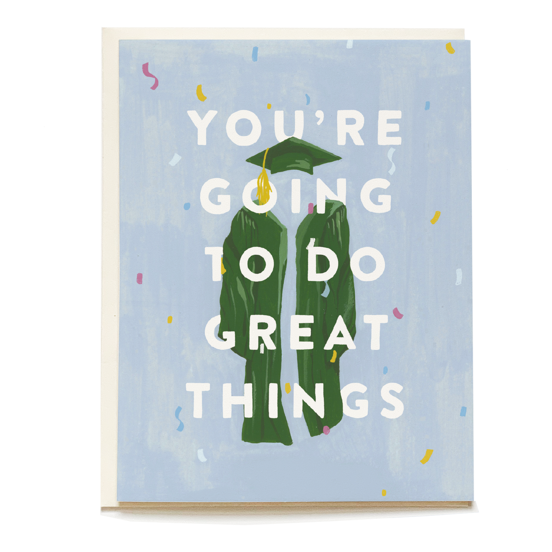 Cap and Gown Graduation Card Sentiment: "You're going to do great things" Card is printed on 100% PC Recycled Paper, made with wind power in the USA Size: A2 (4.25x5.5), blank inside Matching Envelope