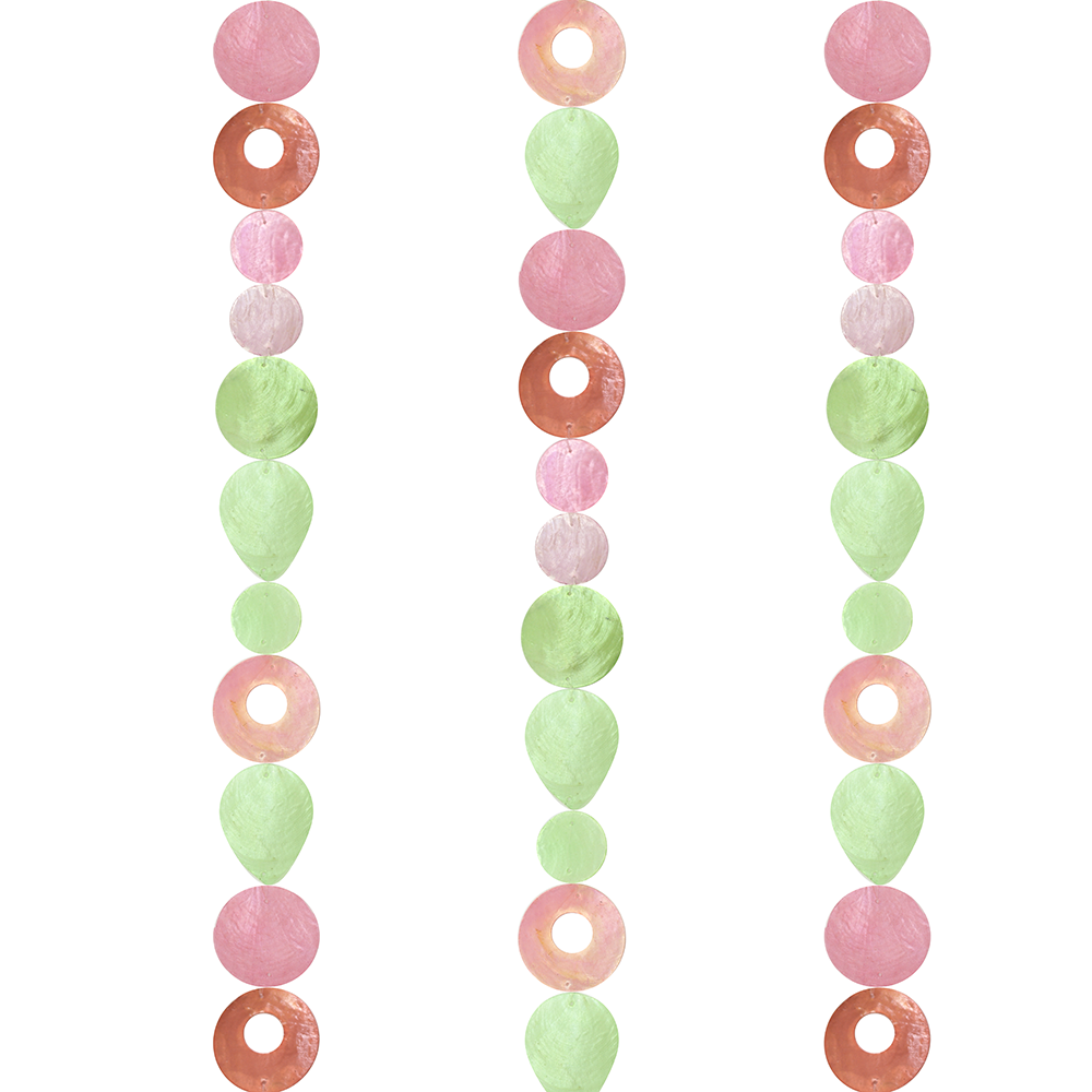 These capiz strands are very popular, coming in a large selection of beautiful color combinations. They create a lovely environment in any setting and come with a metal ring at the top for easy hanging.