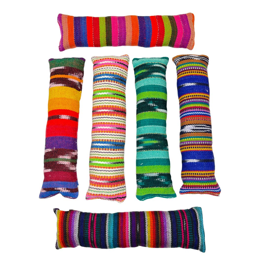 Made by artisans in Guatemala, our 10" tube kicker is made of 100% local cotton textile, stuffed with cotton and enhanced with potent catnip. Karma Cat's partner is a social impact business located in the community surrounding the Guatemala City garbage dump; their work helps to provide education, workforce preparation and emotional support services to the community. They are a 100% women run team, utilizing honest, handmade processes and locally made all natural cotton fabricss and stuffing to make our high-quality, vibrant cat toys.