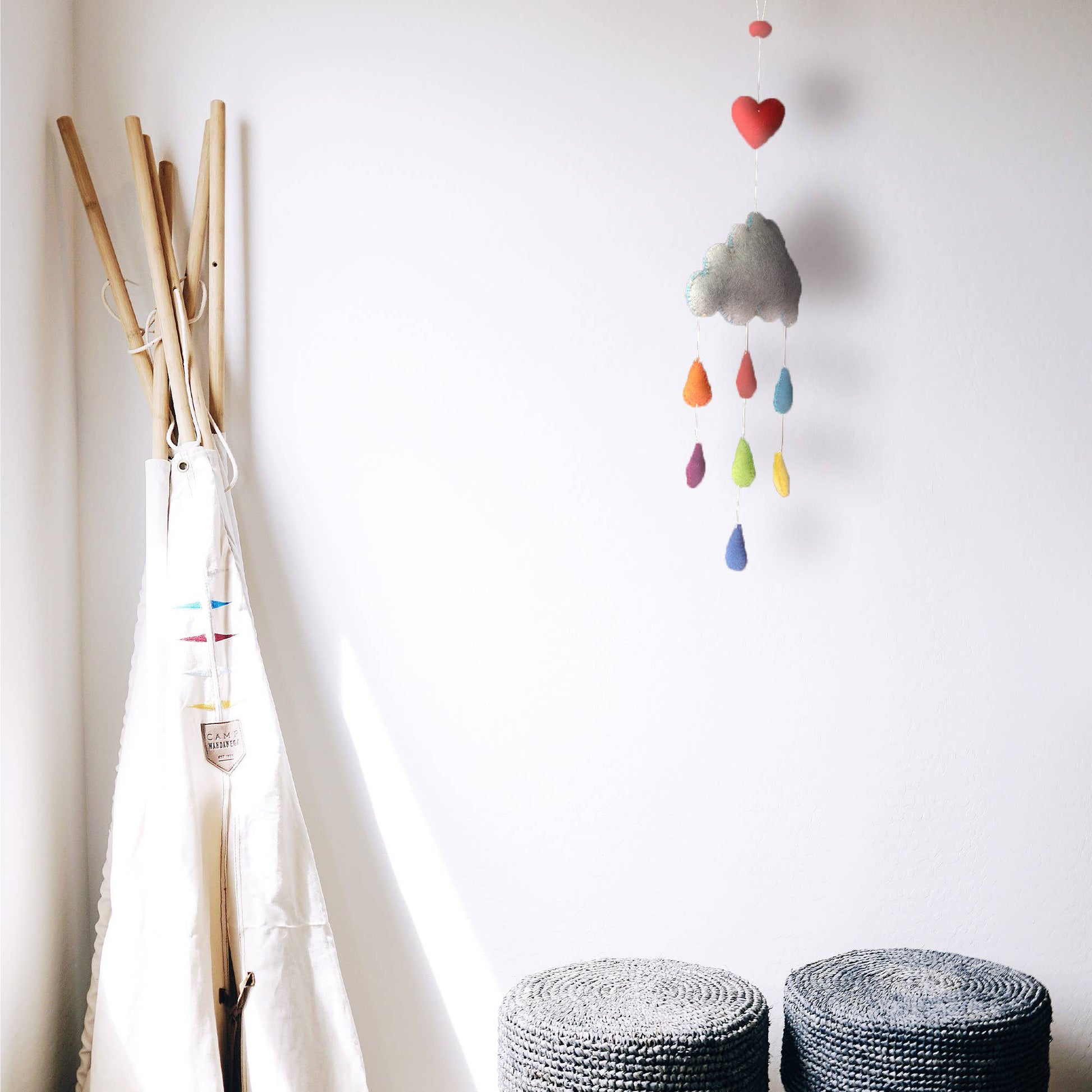 Handmade by Nepalese women, this hand-felted wool mobile with strands of colored clouds and rain drops hangs approximately 24 inches from the top loop. Rainbow colored rain and hearts shower down from a grey-blue cloud.Keywords: nursery , mobile , gift, baby