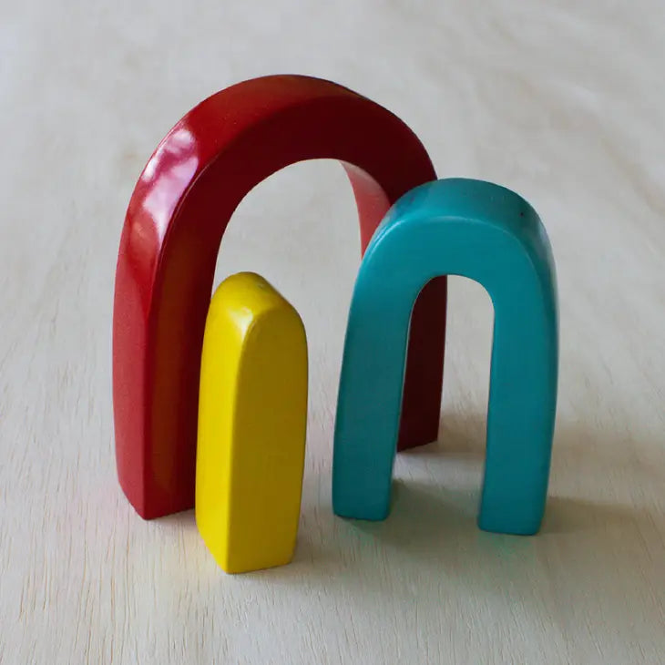 This colorful rainbow is a fair trade product handmade in Kenya. The three pieces are hand carved out of stone, sanded until smooth, dyed bright colors, and then polished.