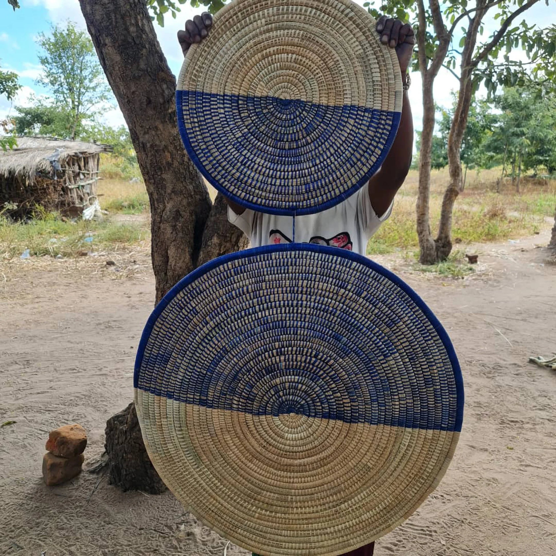 This beautifully woven work was created by talented weavers from Malawi, Africa using age-old basketry techniques that have been a cornerstone of African communities since the beginning of time. Baskets have long been used to transport water, food, and goods (typically atop the head). The art is made from local mulaza palm leaves that are harvested, dried, threaded, and dyed. The painstaking detail of each coil, sunburst, or stitch is evident in the intricate designs; one piece can take five days to complete. It’s common in the villages to see groups of artisans under the shade of mango trees working collectively