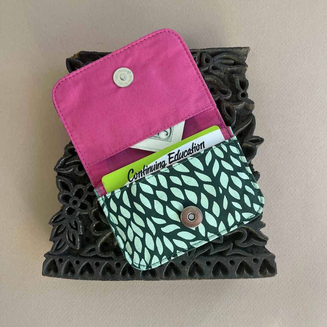 Perfect for use as a business cardholder or as a small wallet. The unique, screen printed design is fun and fashionable. Each cotton fair trade card holder is hand printed and sewn. Perfect size for credit cards, driver's license, business cards!