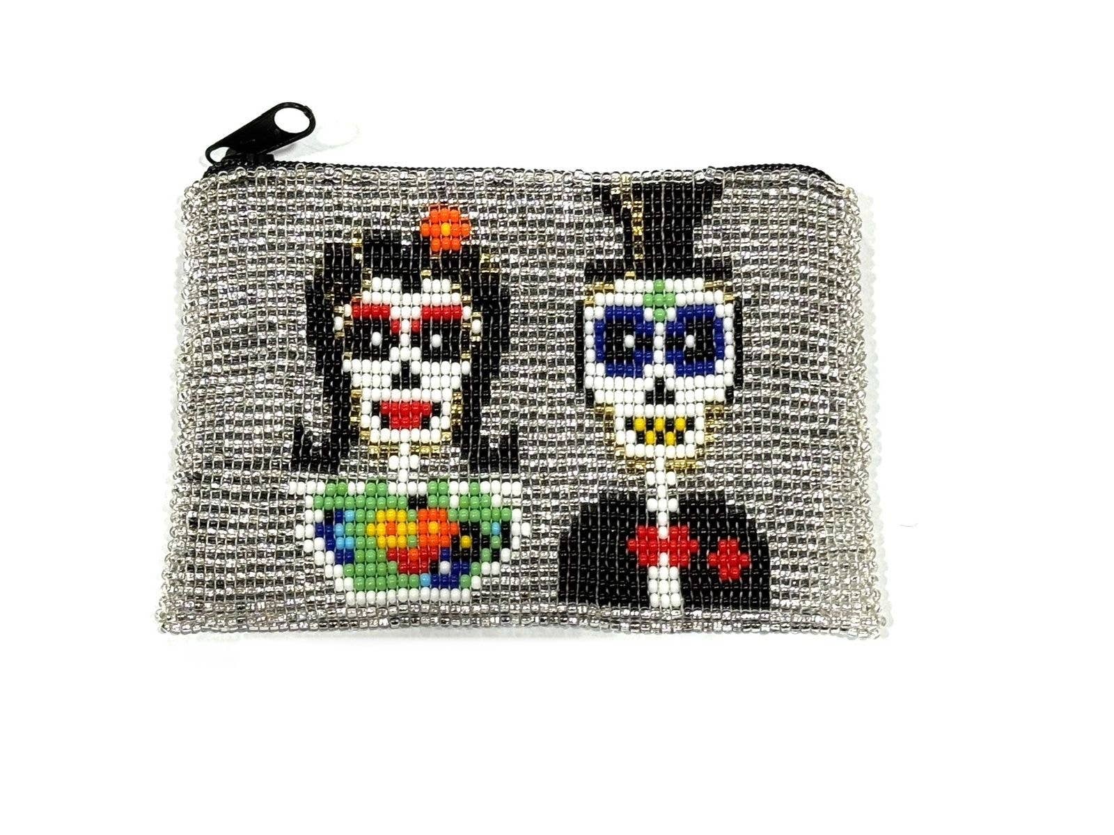 Celebrate love and tradition with this vibrant beaded coin bag featuring a sweet Catrina couple in full Día de los Muertos flair. Dressed in festive sugar skull style, El Catrín and La Catrina add a pop of color and culture to your everyday essentials. Perfectly sized for coins, cash, cards, or tiny treasures, this pouch adds a pop of culture to your everyday carry.