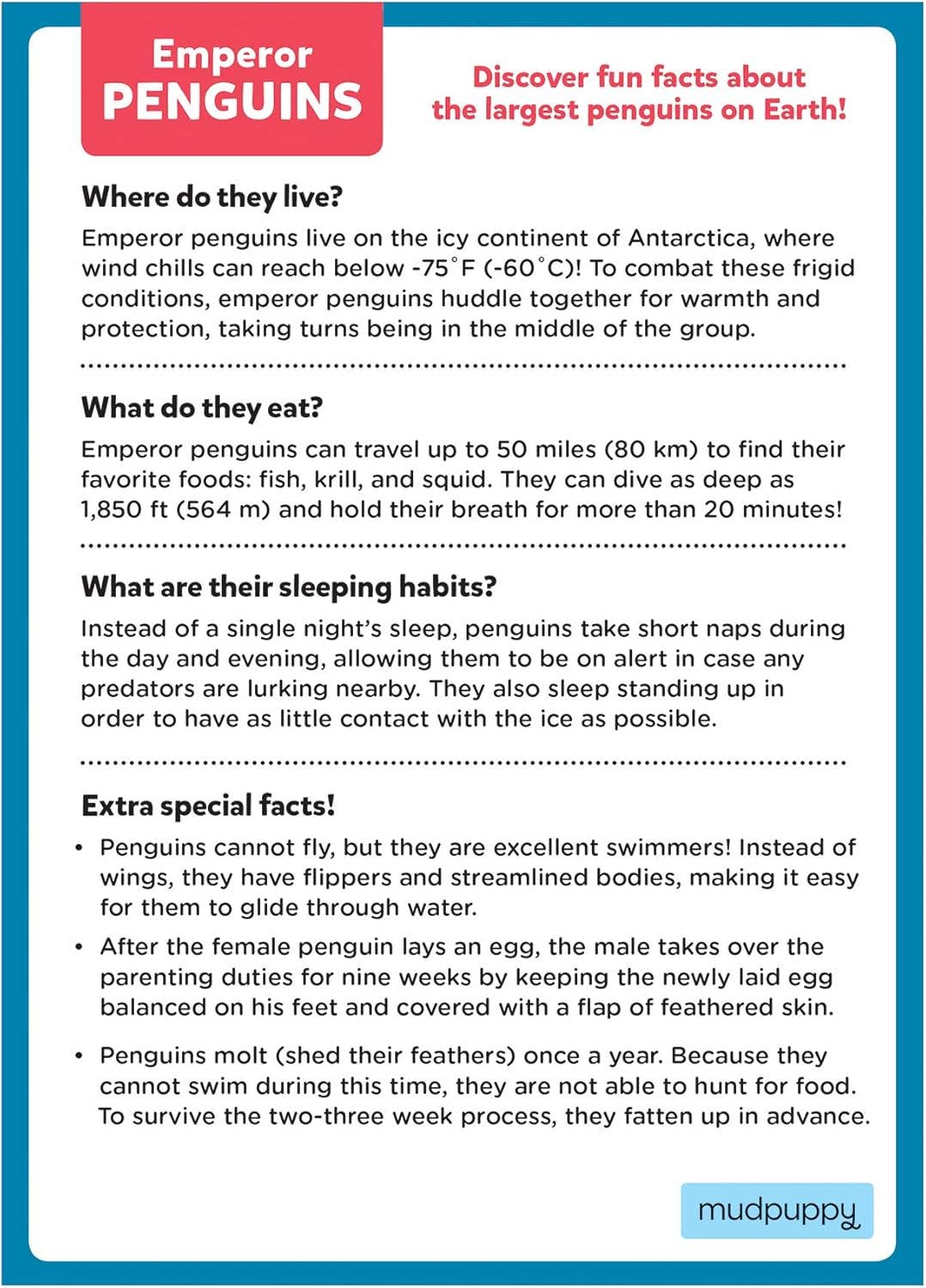 Emperor Penguin Mini Puzzle from Mudpuppy is a small size puzzle featuring a realistic image of an Emperor Penguin in its natural habitat. The 48 piece finished puzzle measures 8 x 5.75" so it's perfect for train or airline tray tables. A two-sided insert includes an image of the puzzle on one side and fun facts about the Emperor Penguin on the other!