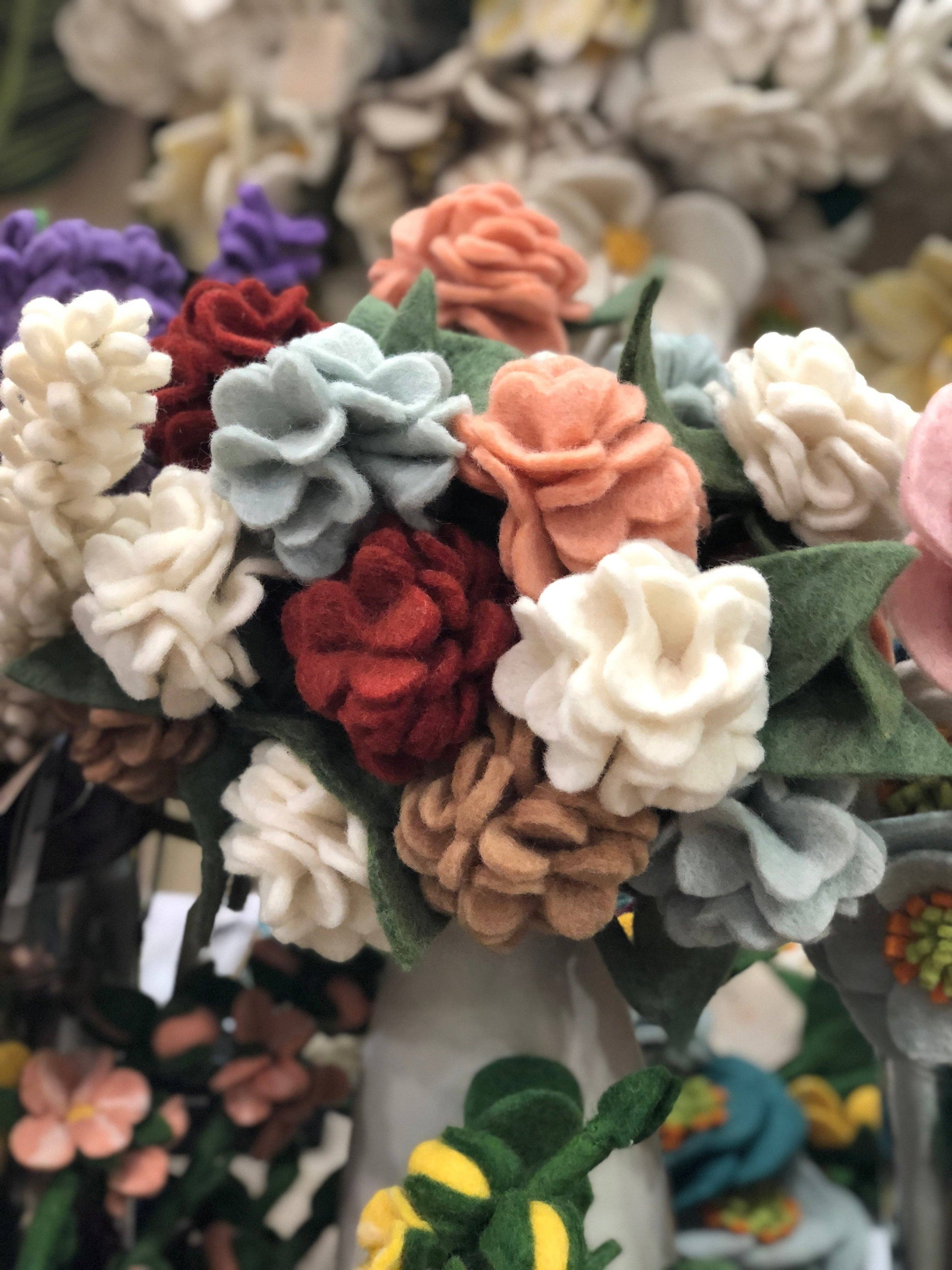 The sweet and soft Felt Geranium Flowers are a special spring stem to brighten anyone's day. Each bloom has tufted and cinched layers of petals and a two leaves that have all been dyed, cut and stitched by hand. The bendable wire stems are simple to manipulate into a bouquet or flower display.