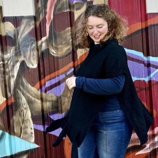 Decidedly different! This roomy top mimics a poncho, while adding a cowl neck, a pocket in front, and decorative strips at the bottom. It's made of soft gauzy cotton, with coconut shell buttons securing the sides.