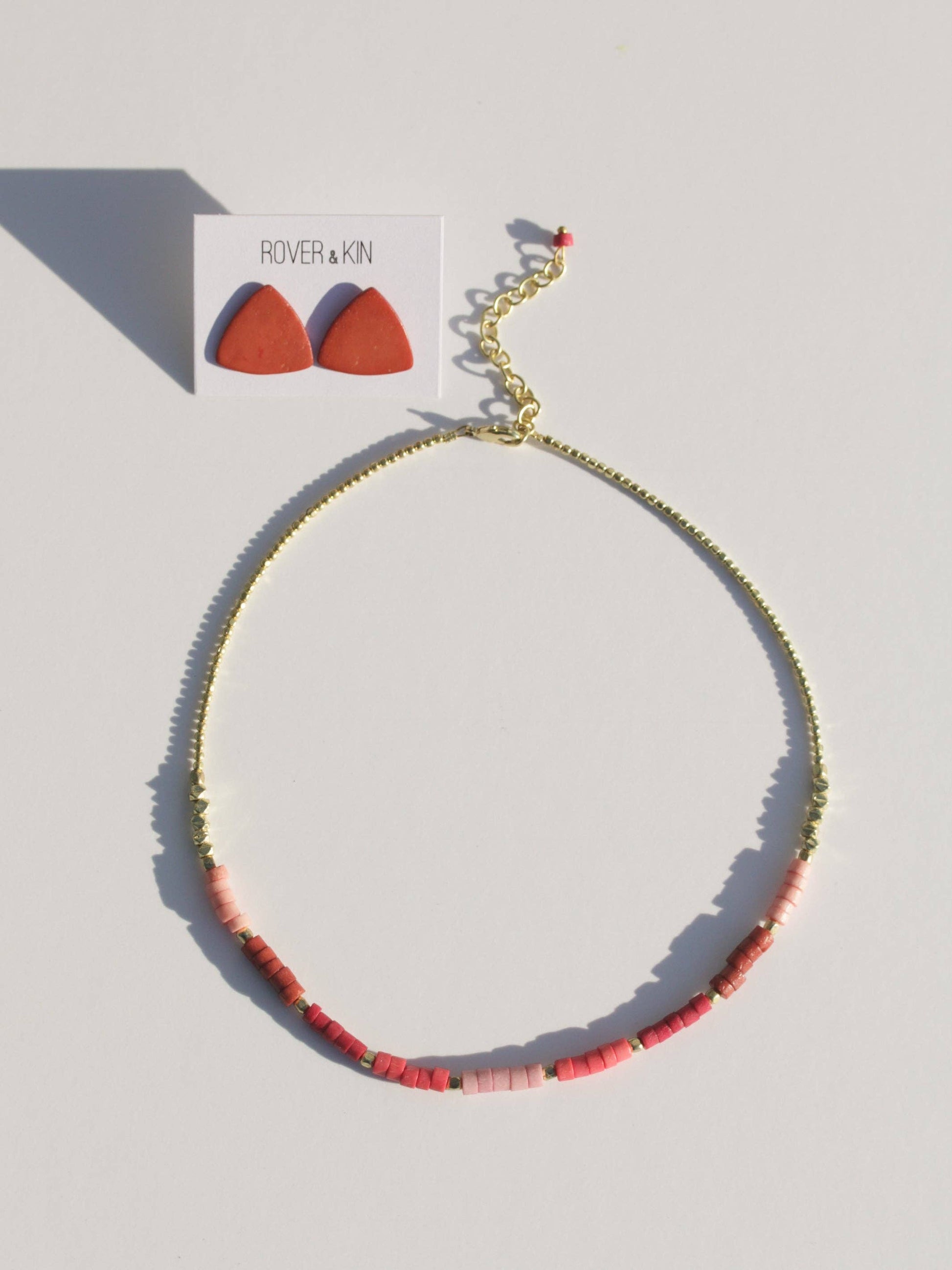 Show off the shades of pink and ruby with this gradient beaded necklace. Pair with our Mod Triangle Studs in Ruby!
