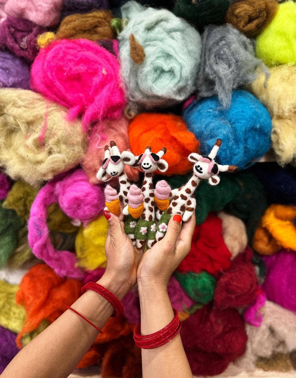Ginny is on her vacation and has her out of office on! Pink heart sunglasses on her head, shorts on and Ice cream in hand, life is feeling good. Her beautiful green shorts have 2 needle felted daisies to the front and back of her shorts. Ginny the Giraffe has been crafted with care and attention to detail using sustainable and biodegradable materials helping her chill out on her holiday.