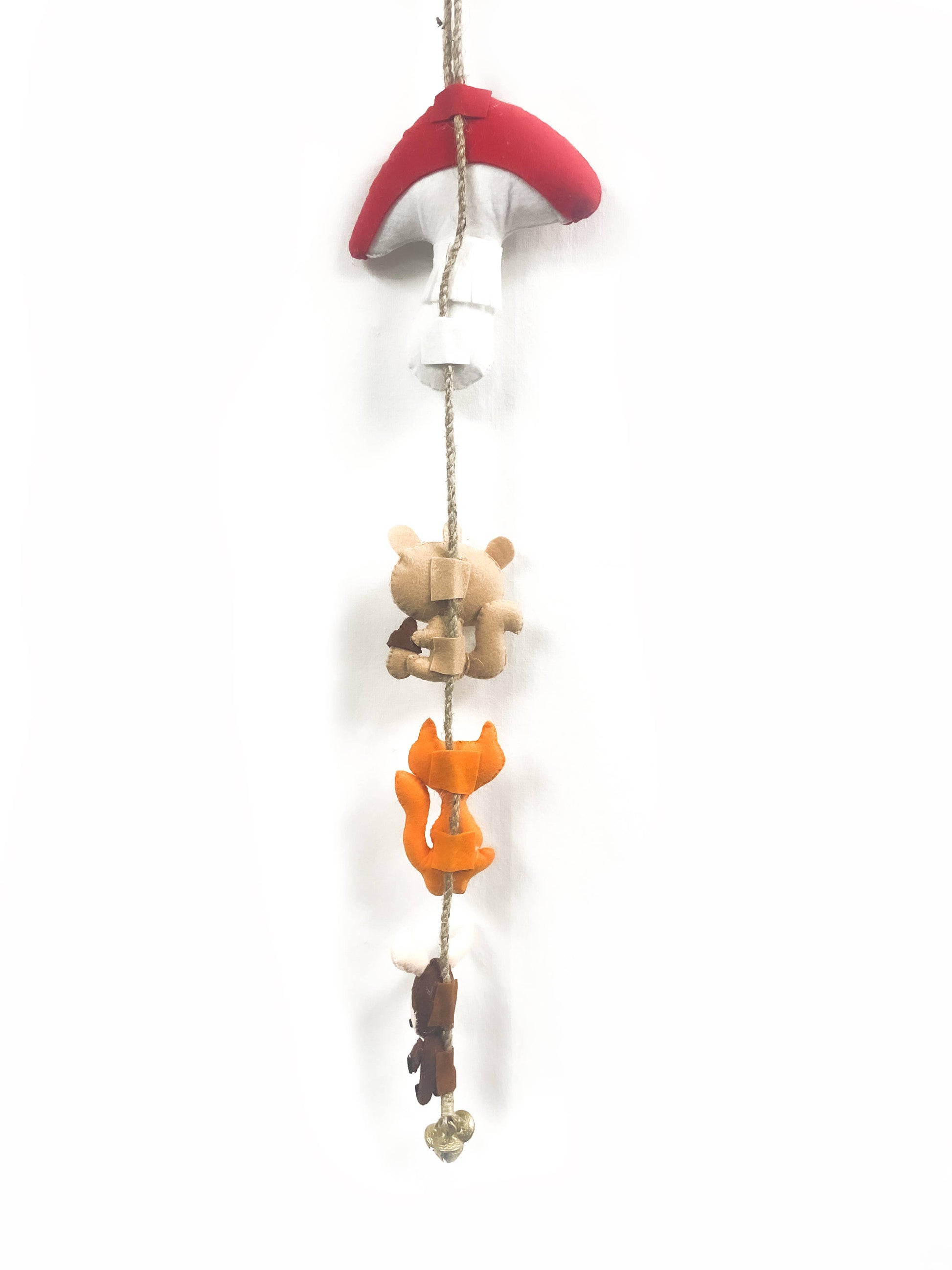 This charming woodland creatures wall hanging/mobile is handcrafted from soft felt and stuffed with poly-fill, featuring a squirrel holding an acorn, a fox, and a moose with hand-stitched beads for the eyes. This adorable trio is suspended with twin from a classic red capped mushroom. The bottom features 3 small brass bells. Each piece is carefully sewn, creating a whimsical, nature-inspired decoration. It's perfect for a nursery, playroom, or any woodland creature lover.