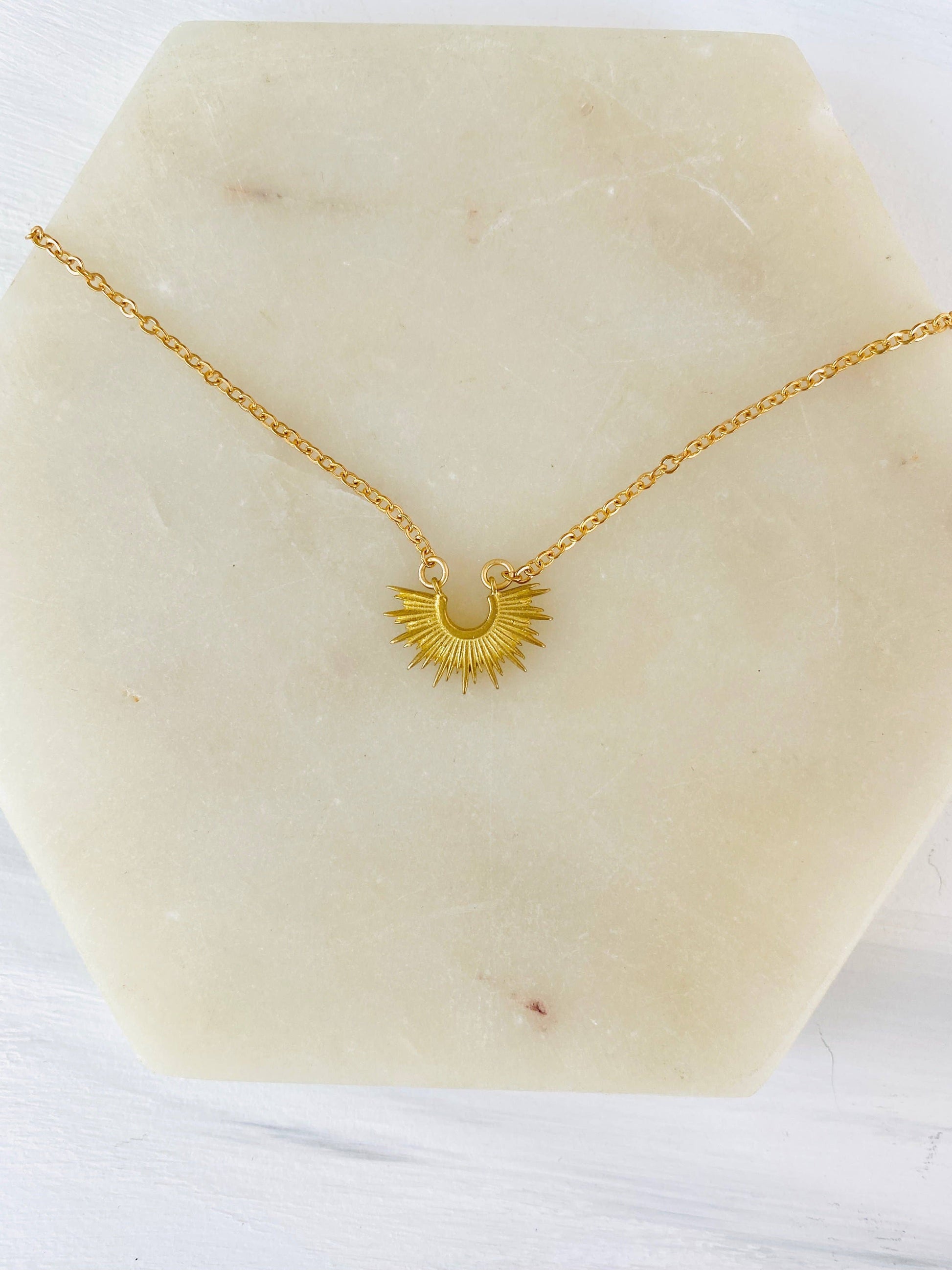 This brass half starburst necklace boasts of either a sunrise or sunset, you decide. Simple and easily layered with other pendants, this piece is versatile and an easy go-to.