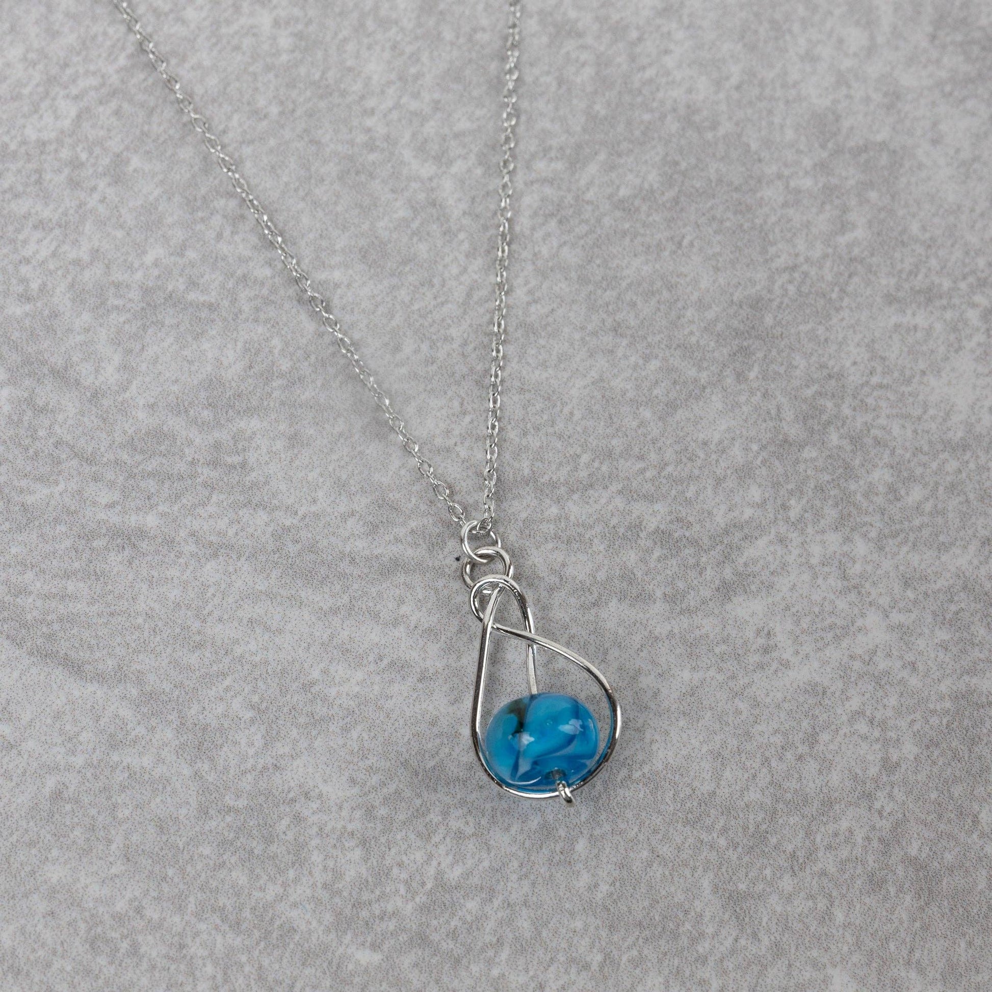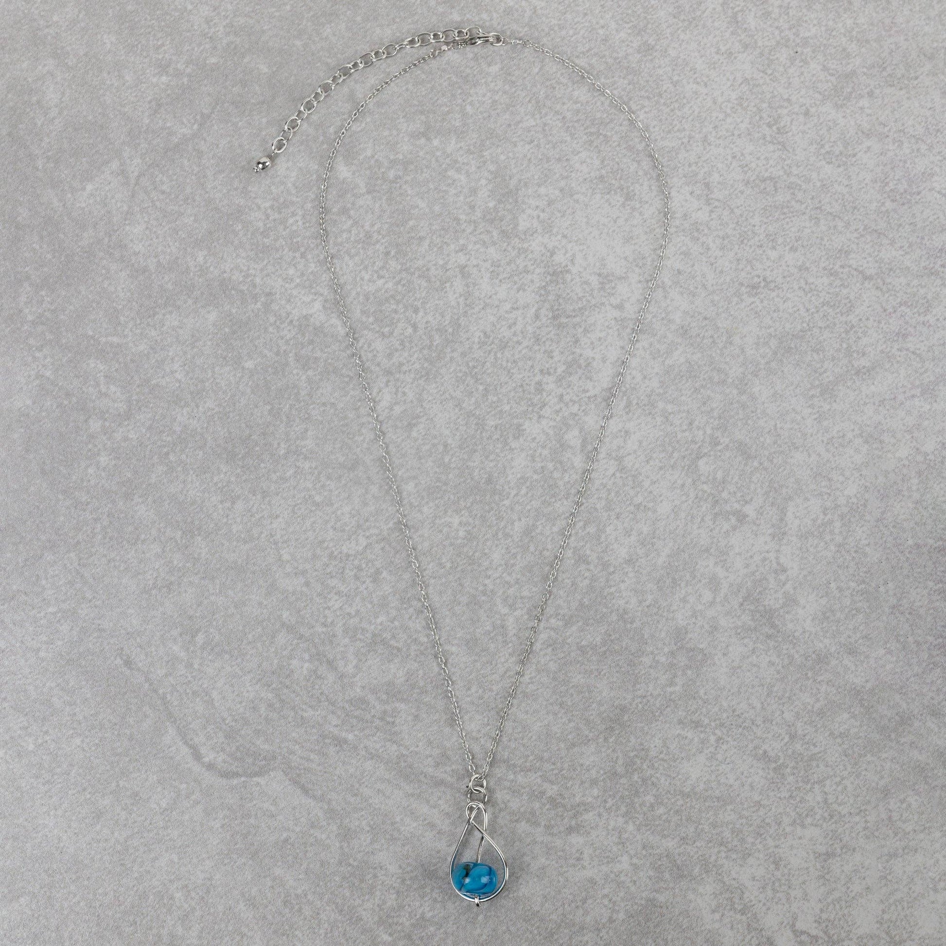 A pendant necklace that is unique, yet understated. The Isai Pendant Necklace features a blue glass marbled bead cradled in swirling wire and is the perfect accent for any outfit. The chain is adjustable for comfort. Handcrafted in India by our fair trade partner Tara Projects, which helps to transform artisans' lives and communities with new opportunities to earn sustainable income. Materials: Glass, brass with silver electroplating
