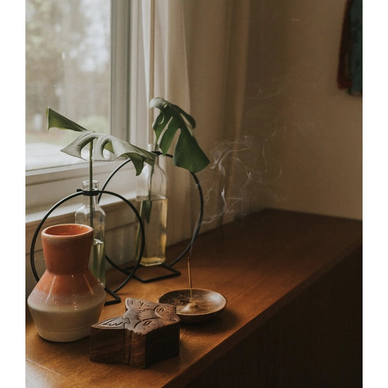 Ethically handcrafted from sustainably harvested mango wood in north central India, our Jyotisha Collection features a beautiful, brass inlaid constellation design. This unique round incense holder dish features a small hole at center where an incense stick can be inserted. Ashes drop cleanly into the surrounding dish. The art of traditional Indian wood craft requires mastery, passed on through generations, to create intricately hand carved treasures from solid blocks of mango wood.