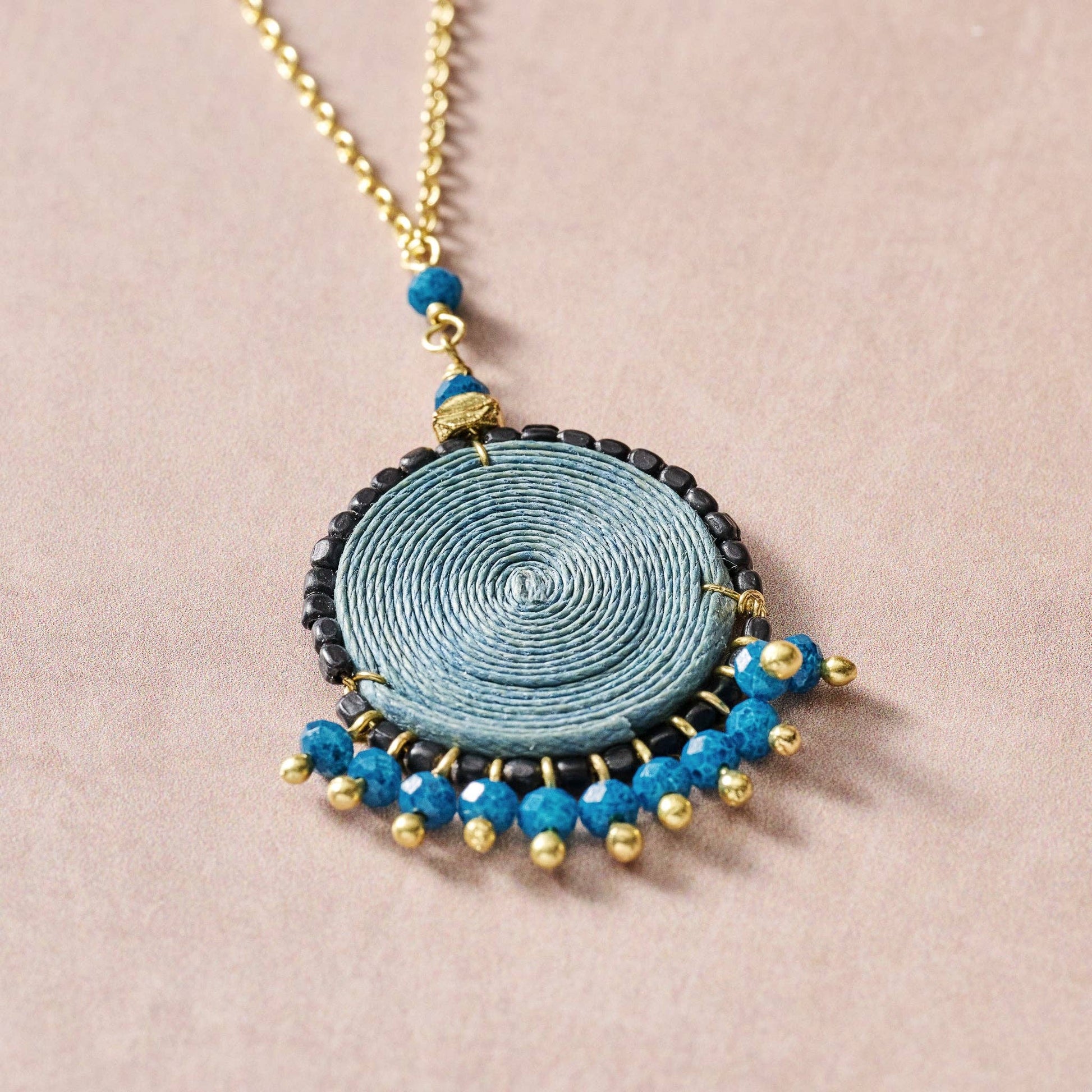 The Meera Blue Beaded Pendant Necklace features a unique coiled jute pendant surrounded by delicate glass beads. This necklace is adorned with hanging beads and playful brass accents. With adjustable links for the perfect fit, it's a fun and versatile addition to any outfit. Artisans with TARA Projects in India are offered consistent, safe work, fair wages, medical insurance and access to savings programs, interest-free loans and more. Materials: Brass, jute, glass - Measures: 25-27.75"L, pendant - 0.75"D