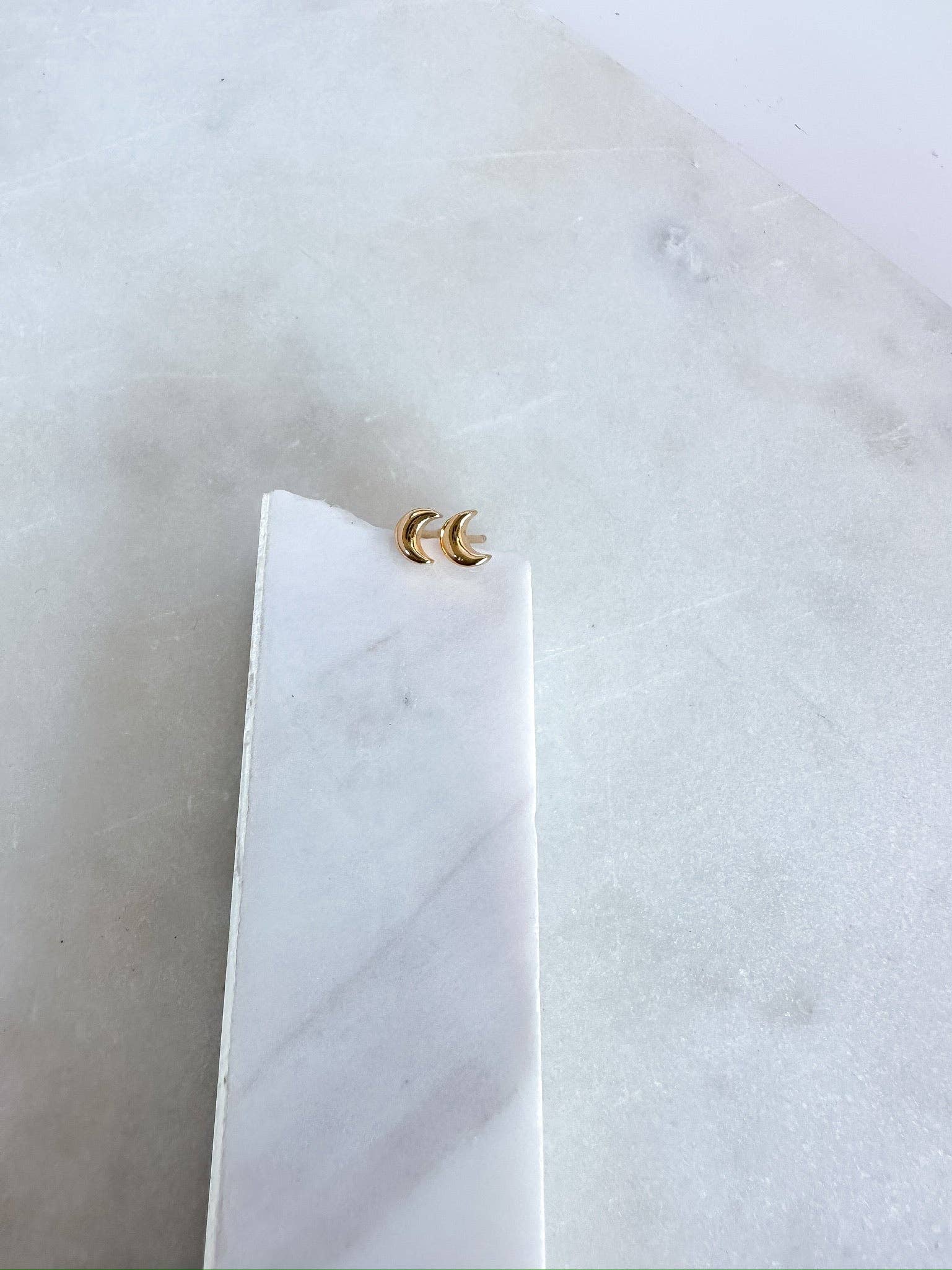 Mini moons These teeny tiny studs feature the most adorable little crescent moon, perfect for all the minimalists out there or those with multiple piercings. Made with 18K gold plated brass. Hypoallergenic and nickel free Earrings measure 0.15"