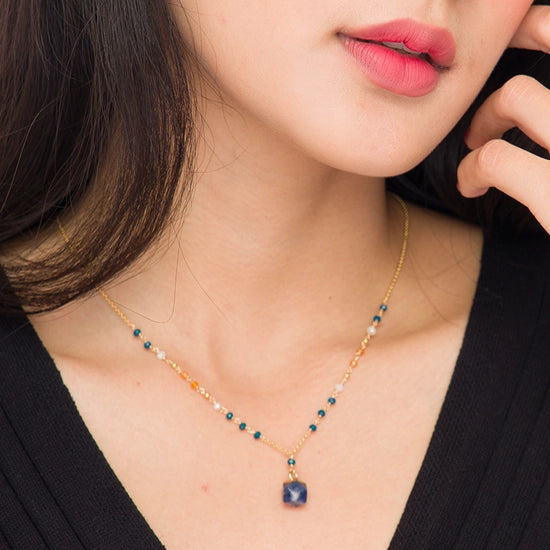 Semi-precious stone, crystal, and hypoallergenic brass.