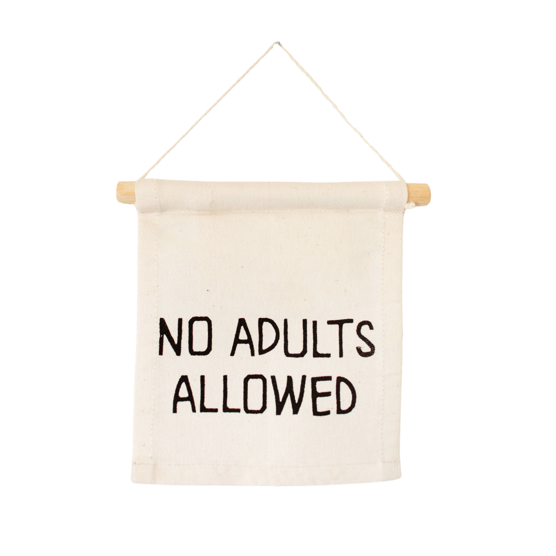 "No adults allowed" hang sign on natural canvas with a poplar wooden dowel.