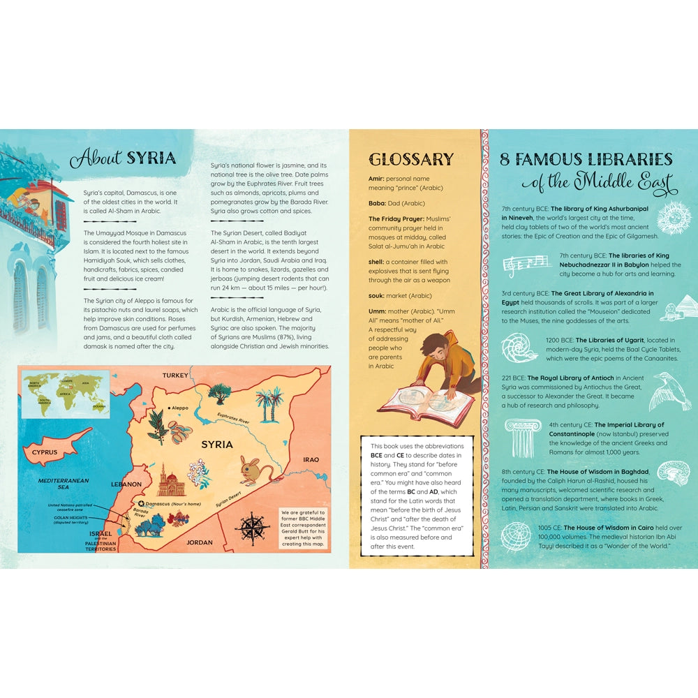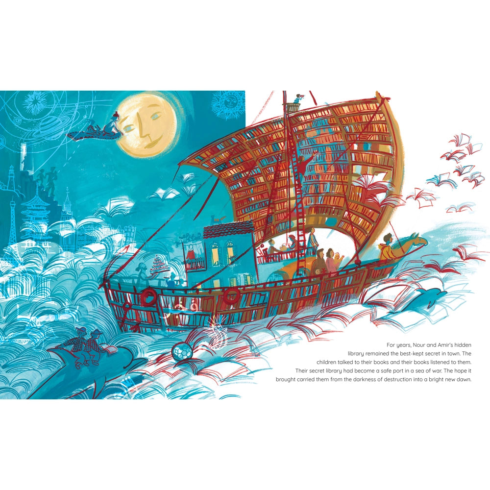 Forced to take shelter when their Syrian city is plagued with bombings, young Nour and her cousin begin to bravely build a secret underground library. Based on the author’s own life experience and inspired by a true story, Nour’s Secret Library is about the power of books to heal, transport and create safe spaces during difficult times. Illustrations by Romanian artist Vali Mintzi superimpose the colorful world the children construct over black-and-white charcoal depictions of the battered city.