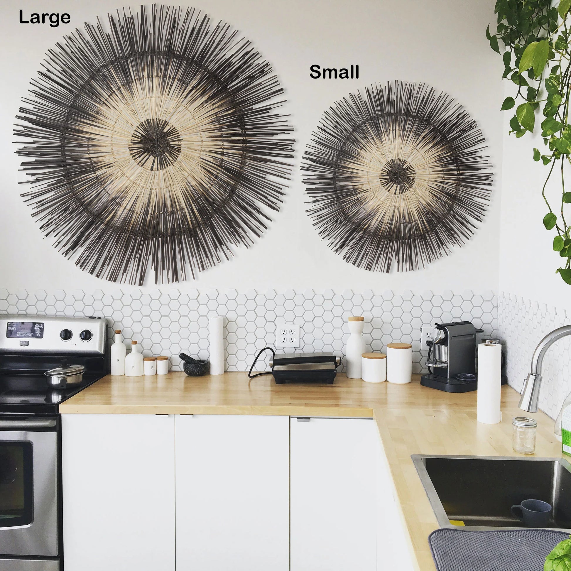 The Sun Circle Wall Decor from the Wokongora Collection (Wokongora means “beautiful” in the local language) is elegantly hand woven by artisans in Malawi, Africa. Each high-impact design is made from harvested mulaza palm leaves which are dried, threaded, and then dyed to create a beautiful masterpiece. The fact that this can take an artisan up to five days to make one piece underscores just how special this is.