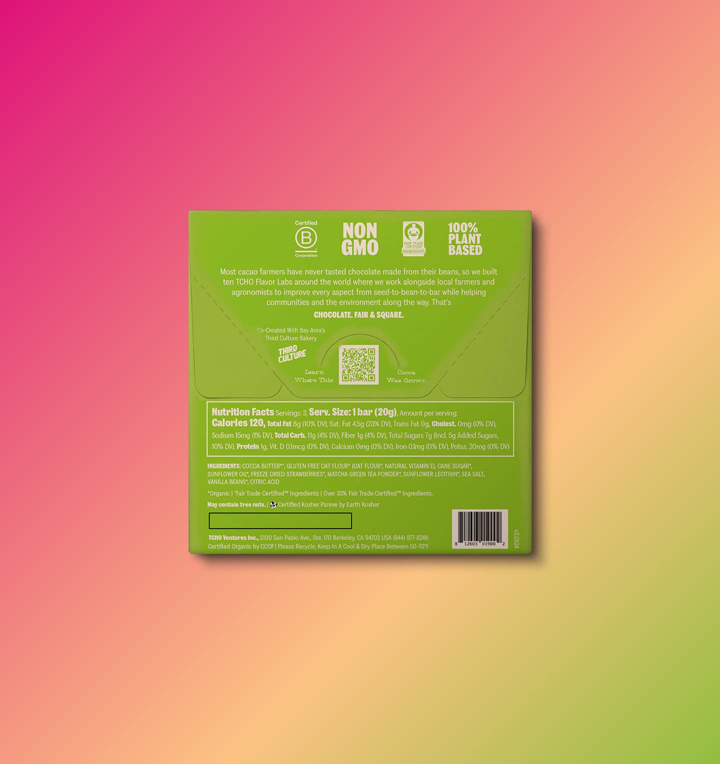We've all got to help each other, whether friends, family, or small businesses. This is why we partnered with our friends down the street at Third Culture Bakery to bring you a chocolate bar inspired by their strawberry matcha latté. A creamy oat milk white chocolate bar with a slightly bitter matcha shell perfectly balanced by the sweetness of its strawberry filling, Perfect Matcha is a celebration of flavor and friendship.