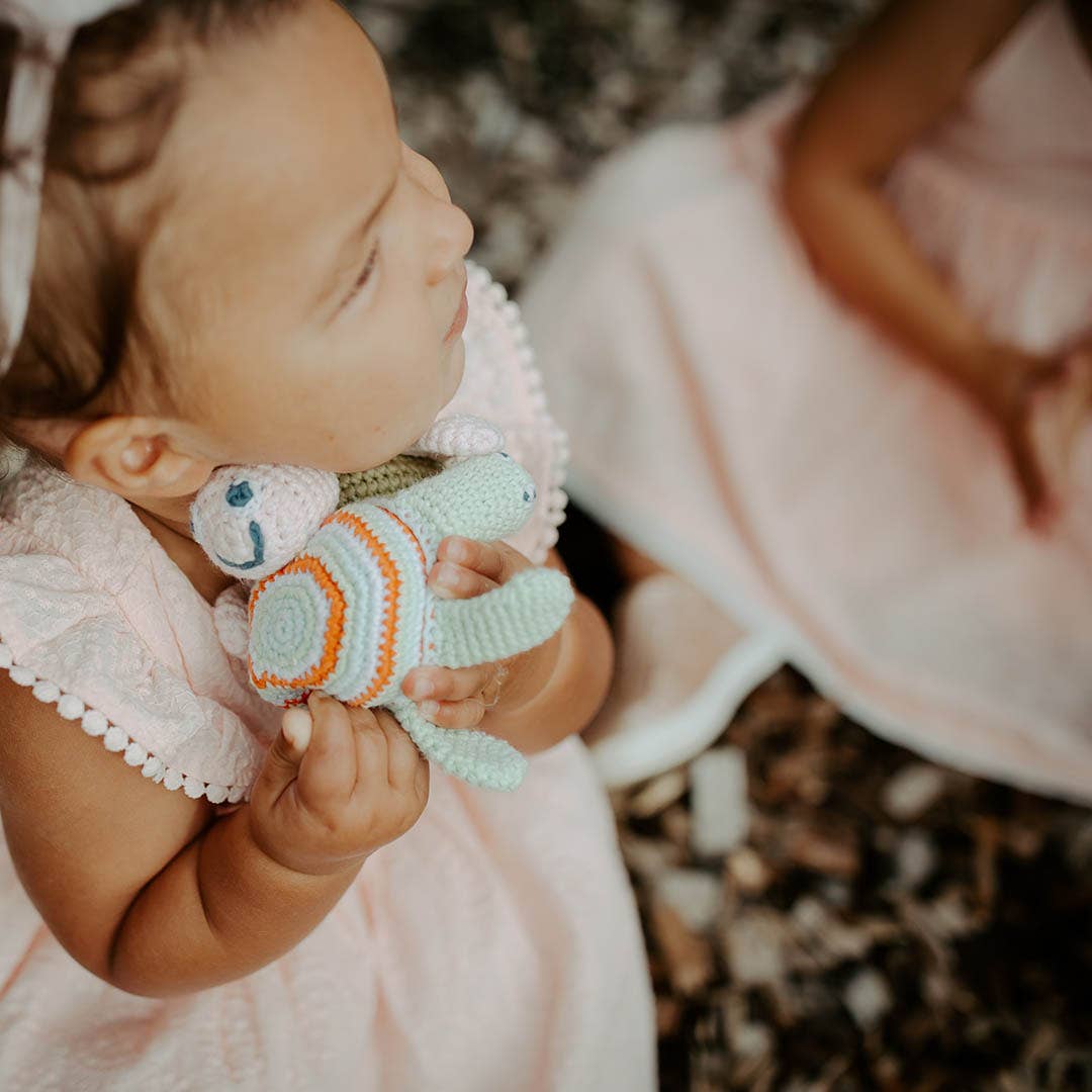 Bring fresh baby gift ideas into your shop with this ocean themed stuffed animal. One of our top sellers, this plush toy is designed for baby's small hands and the rattle makes a very soft jingle when shaken.