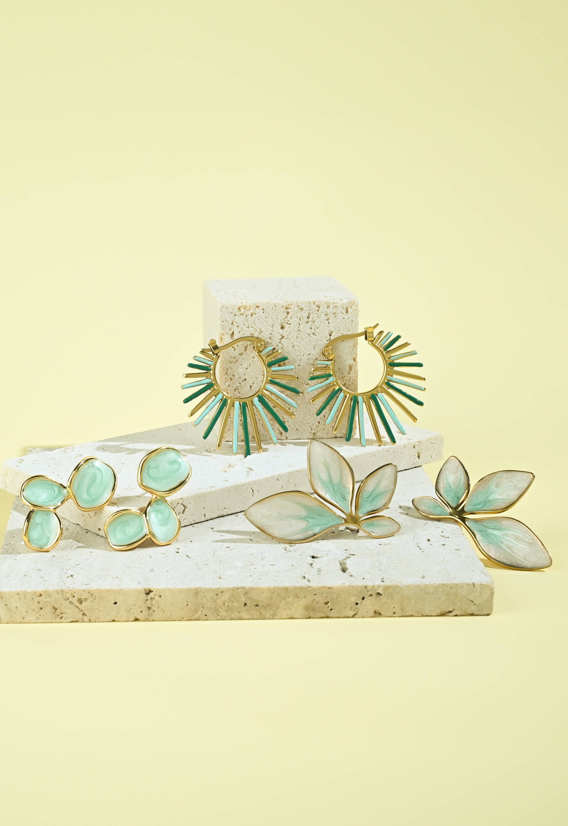 Our Radiant Rise Hoops in mint are pure joy in earring form. The 14K gold-plated finish glows with warmth, while vibrant mint and sky-blue enamel sunrays radiate playful energy. They're the perfect pop of color and hope for every season. Each pair helps provide safe work, holistic care, and a fresh start to women beginning new chapters at Starfish Project. You wear light. She discovers her strength.