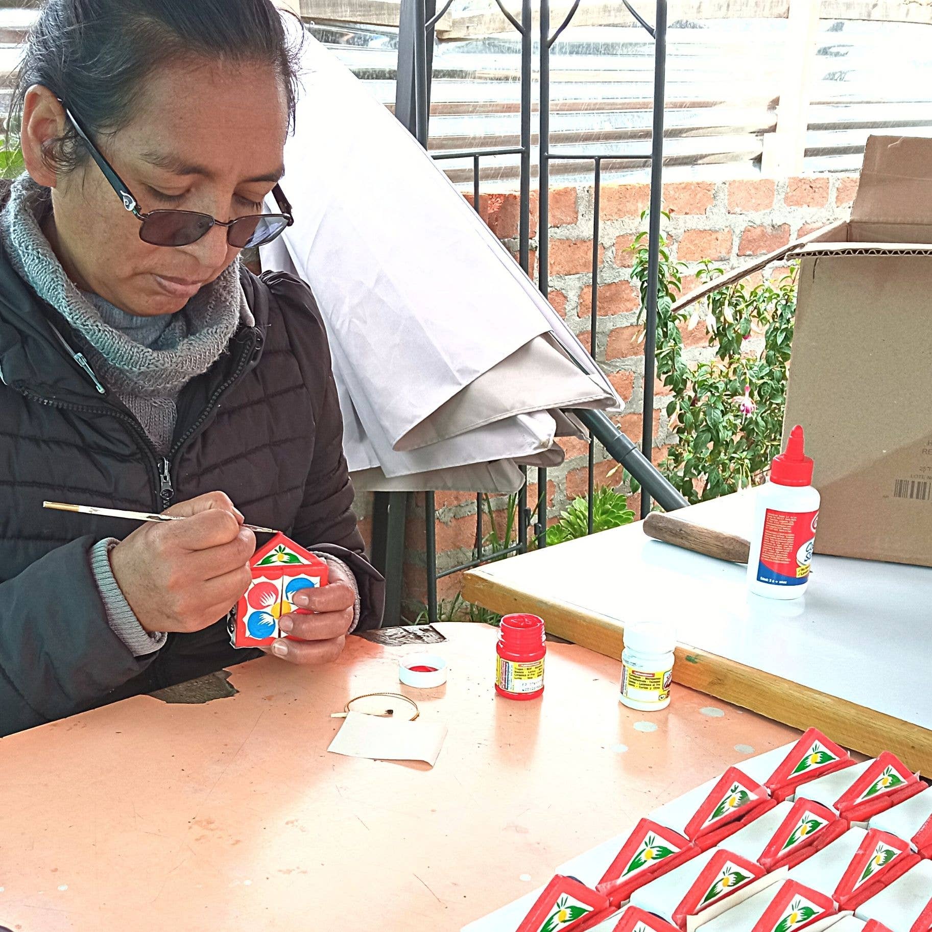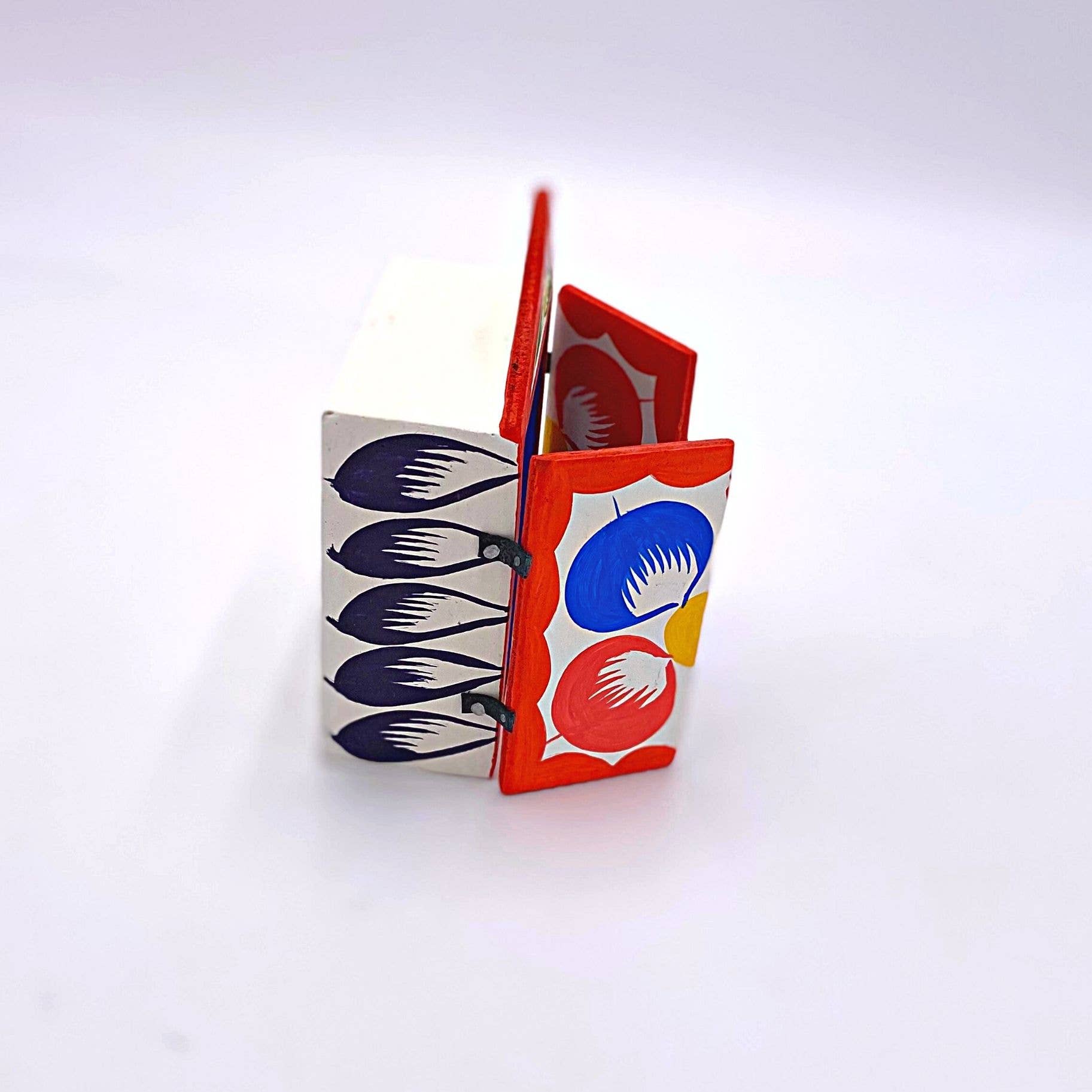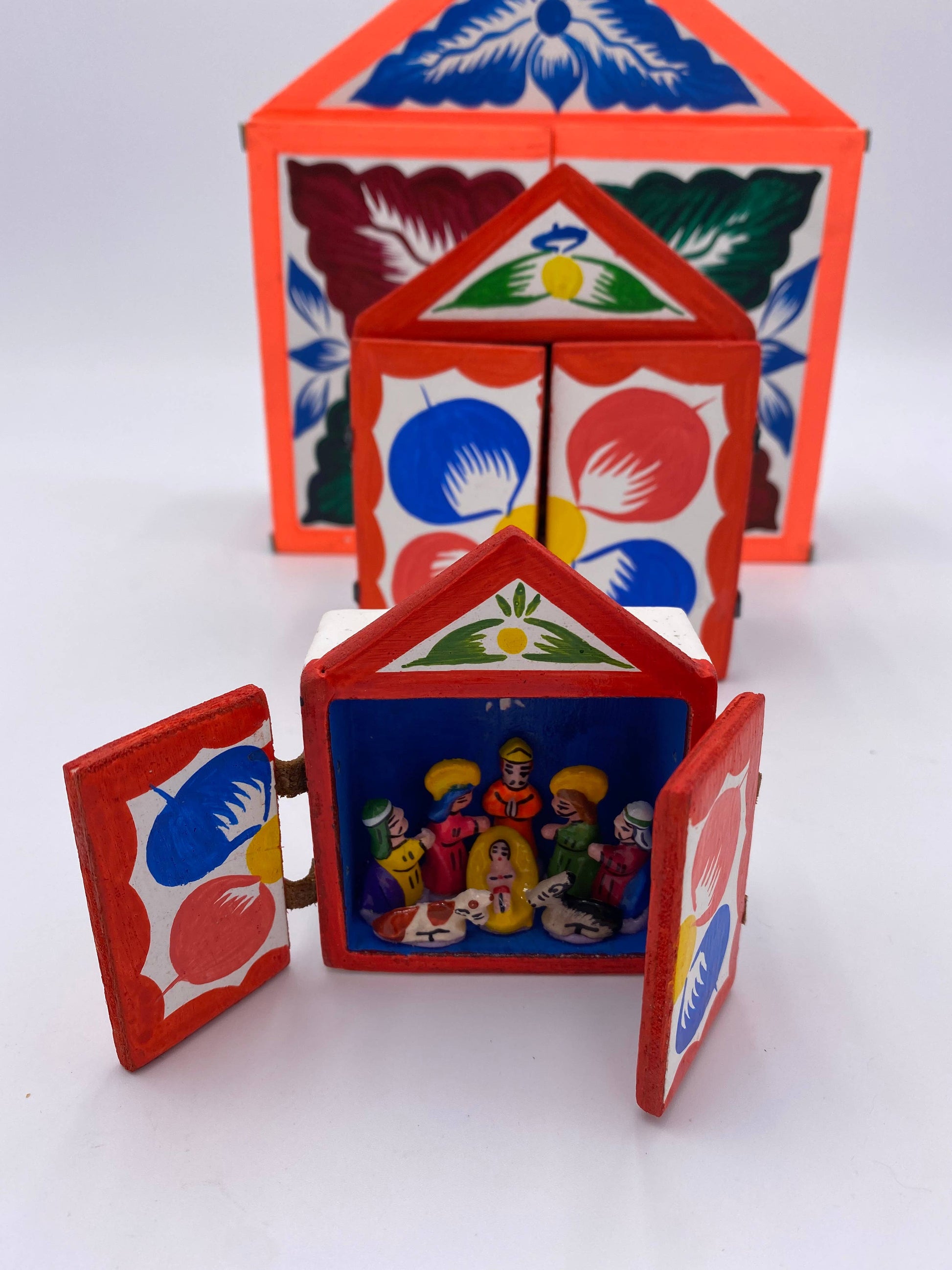 This Retablo is part of the Peruvian Folk Art. It is a handmade and painted wooden box with a colorful flower design that when you open it's like opening the doors to a 3D enclosed Nativity scene made with ceramic figurines under a midnight blue sky.