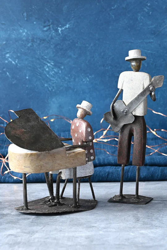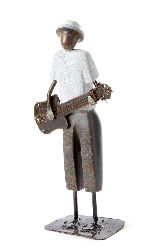 Zimbabwean artist Luke Jimu combines textured pale serpentine stone and recycled metal to create collectible modern art sculptures. Luke's guitarist sculpture makes a thoughtful gift, and pairs perfectly with other members of the Festival Band collection.