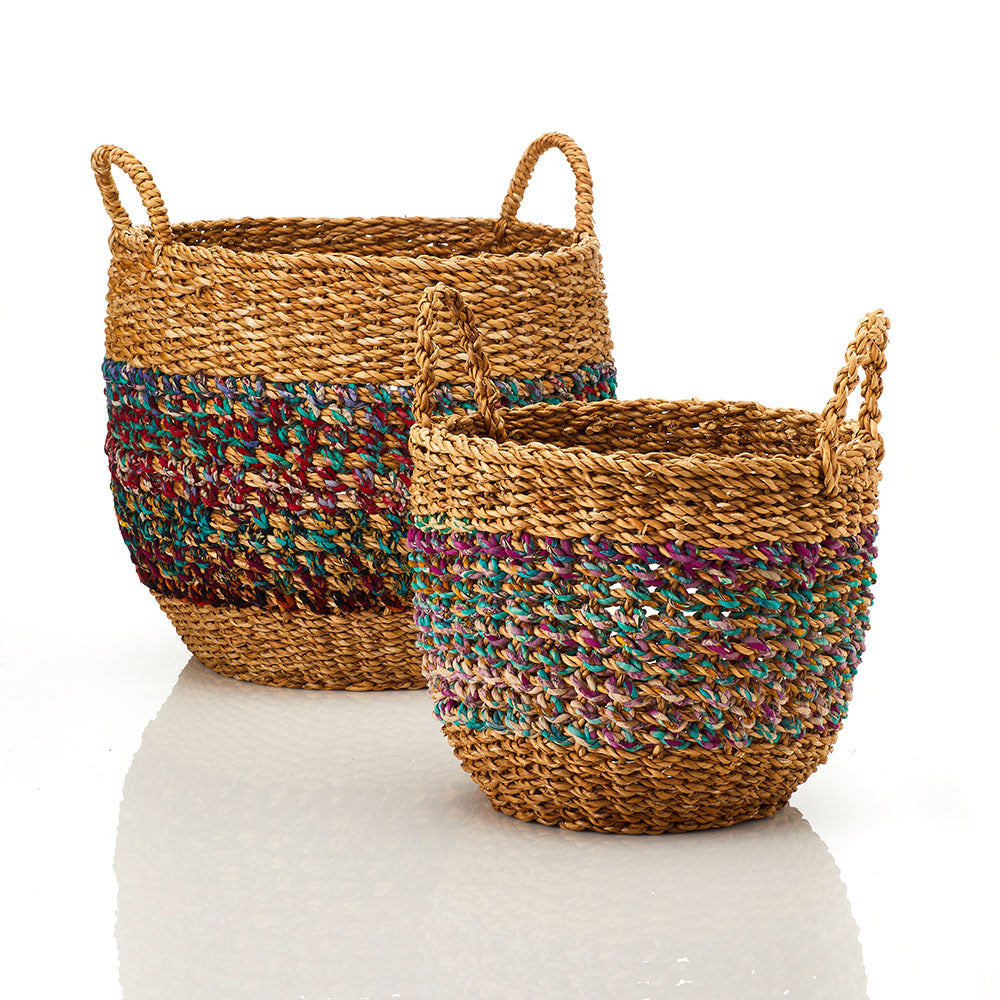 Natural hogla is wrapped with recycled sari to bring a pop of color to these durable nesting baskets that will look great in any room. Sturdy handles. Colors and patterns of sari will vary.