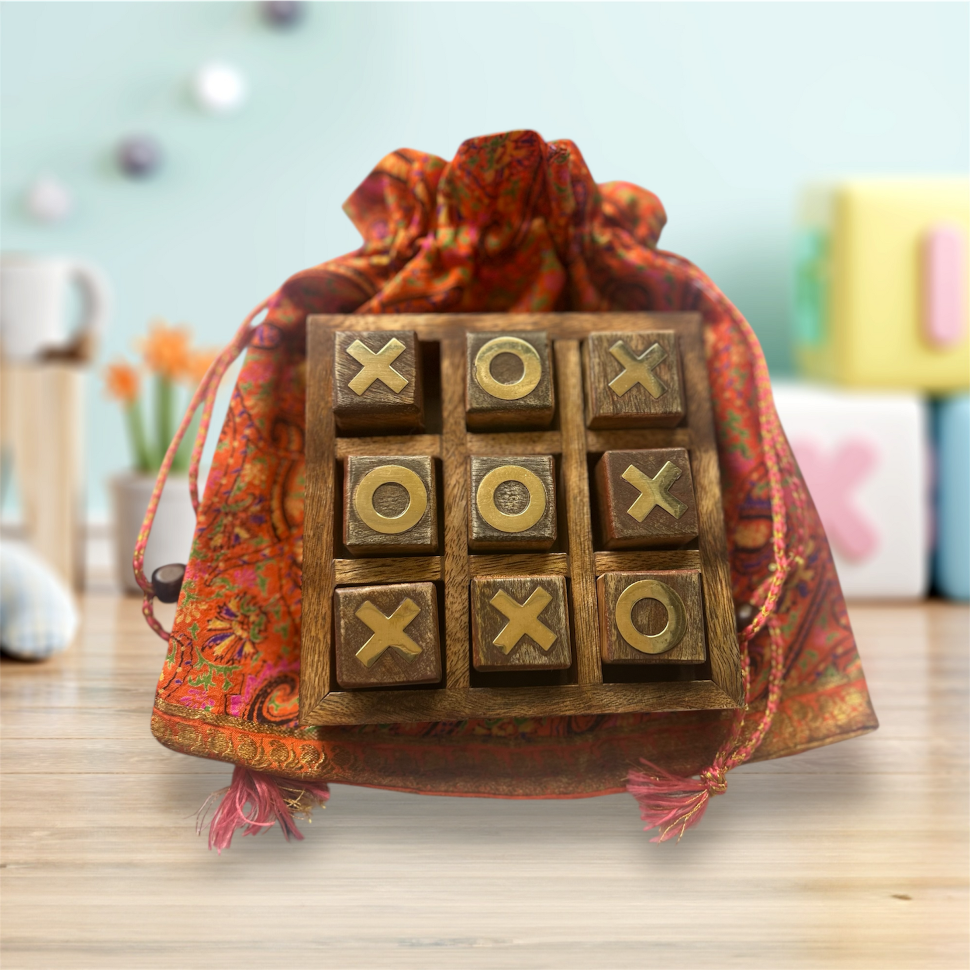 Enjoy the timeless fun of this mango wood Tic-Tac-Toe set, crafted by fair trade artisans in India! Challenge friends to strategic showdowns of Noughts and Crosses, then tuck everything into the included travel bag featuring unique prints. Perfect for game nights, road trips, or anywhere spontaneous play might strike!