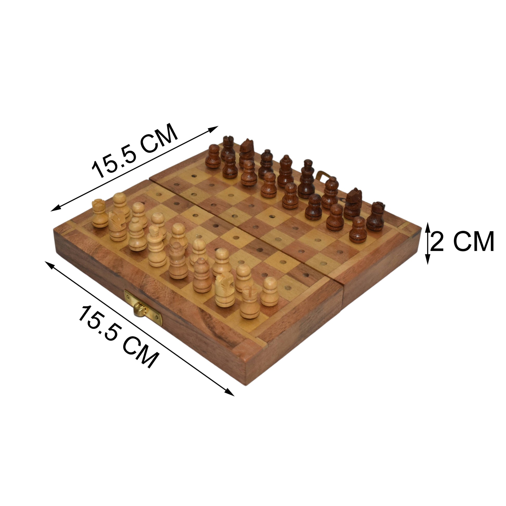 Elevate your game with this stunning foldable chess set, meticulously handcrafted from premium acacia wood. Known for its rich, natural luster and exceptional durability, acacia wood not only enhances the aesthetic appeal but also ensures longevity. The foldable design allows for easy storage and portability, making it perfect for travel or outdoor play. A secure brass clasp keeps the board closed when not in use, protecting the pieces inside.