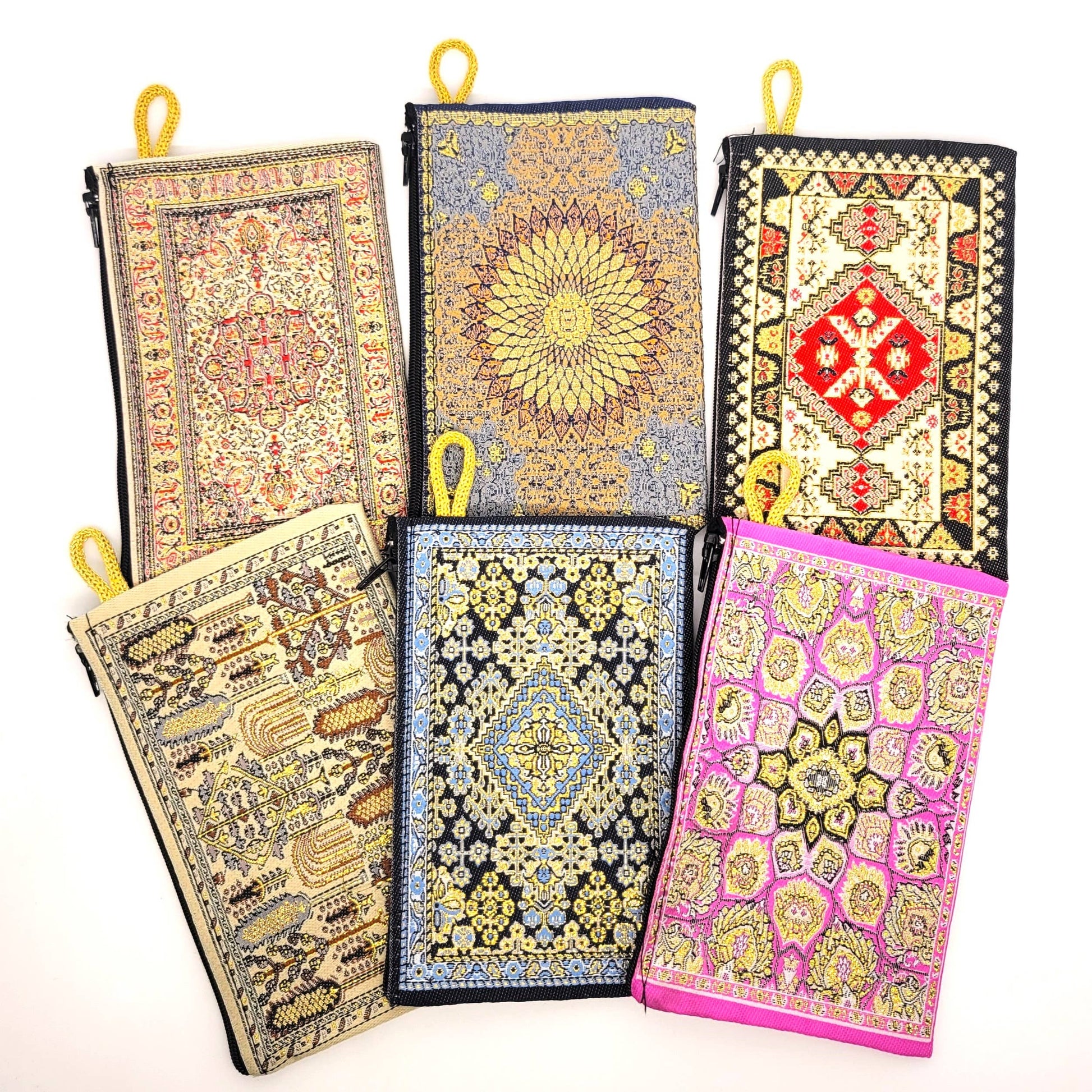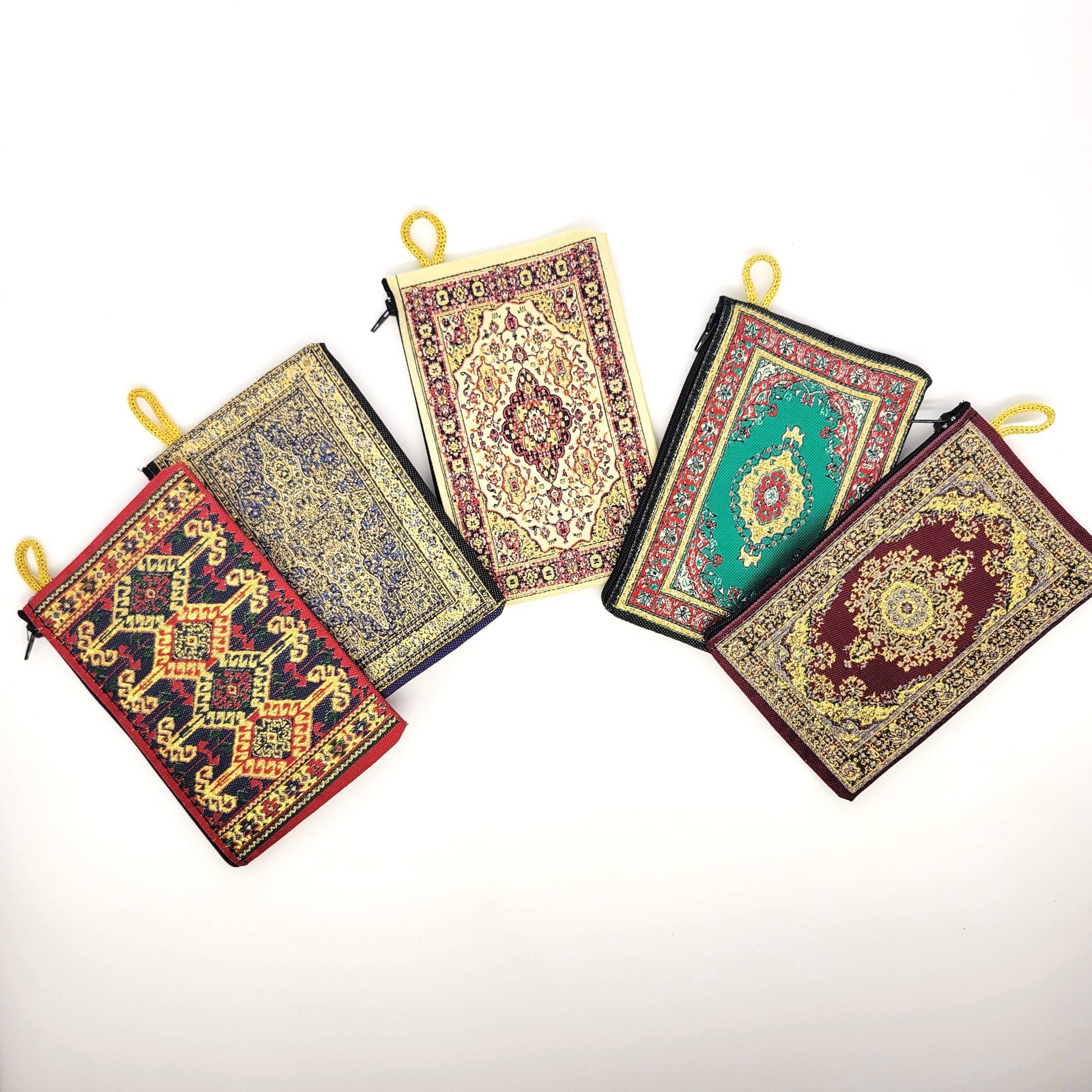 These versatile coin purses offer the style and beauty of Turkish rugs in a little purse that's the perfect size for makeup, money, or those little essentials. Small family cottage industries are the core of hand crafted goods around the world. This small family unit is making wallets, journals, and purses with fabric patterns inspired by the rugs that Turkey is known for.