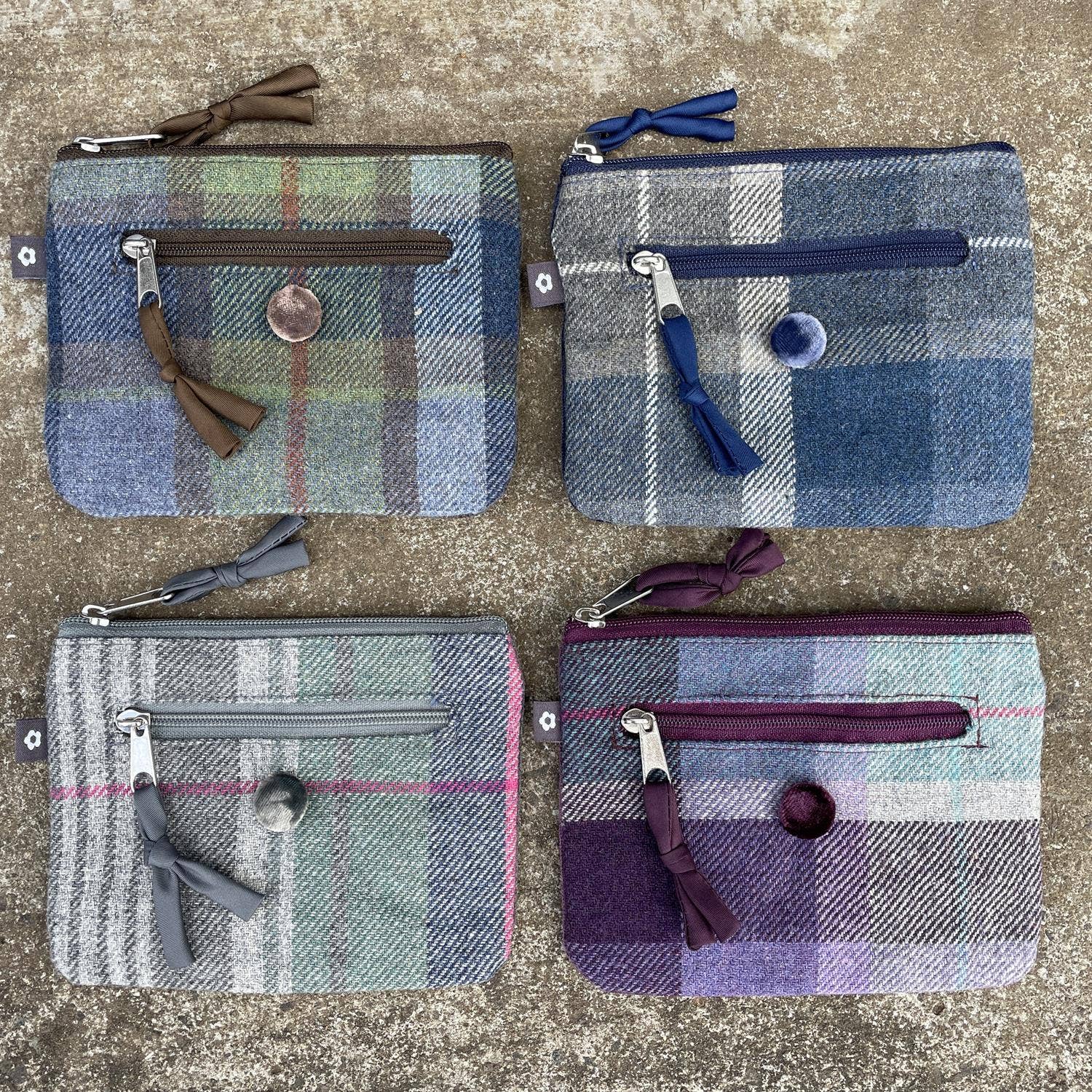 Emily coin purse, in four attractive new Earth Squared tweeds, with cute satin button on the front and two zipped compartments to keep cards and coins separate.