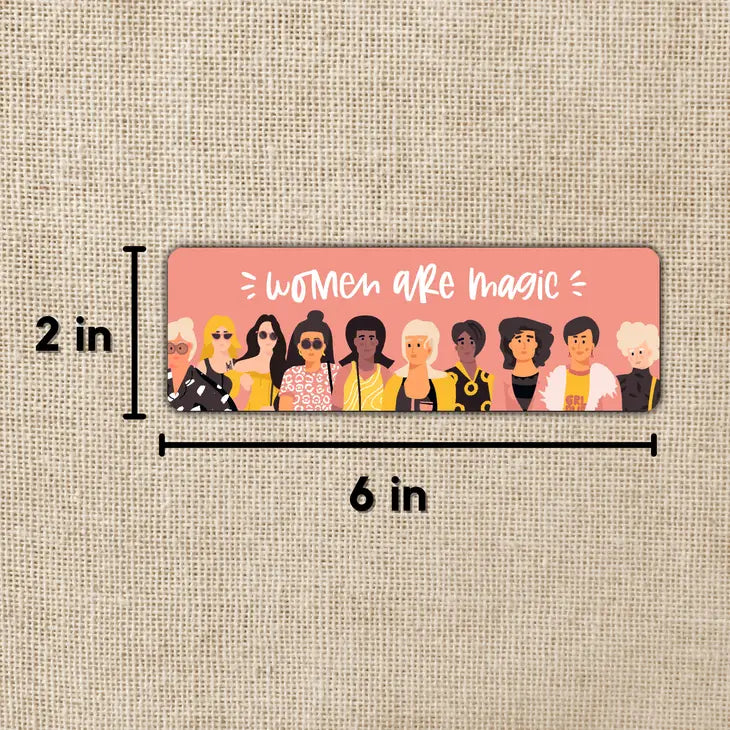 The front of the bookmark displays the phrase "women are magic" while the back showcases an array of diverse female figures. Perfect for saving any page.