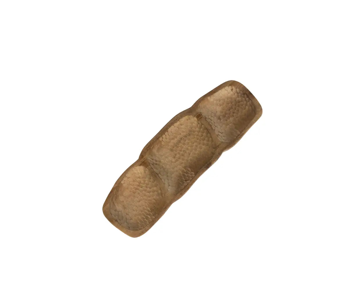 Whether displaying with candles, or putting it to work in the kitchen, this Wood Section Serving Tray features three sections carved from Akashmoni wood. Each one is hand‒carved and unique. All feature a curved, organic shape with a larger center compartment flanked by two smaller. The surface of the tray has a pebble texture carved in, adding to the handmade nature.