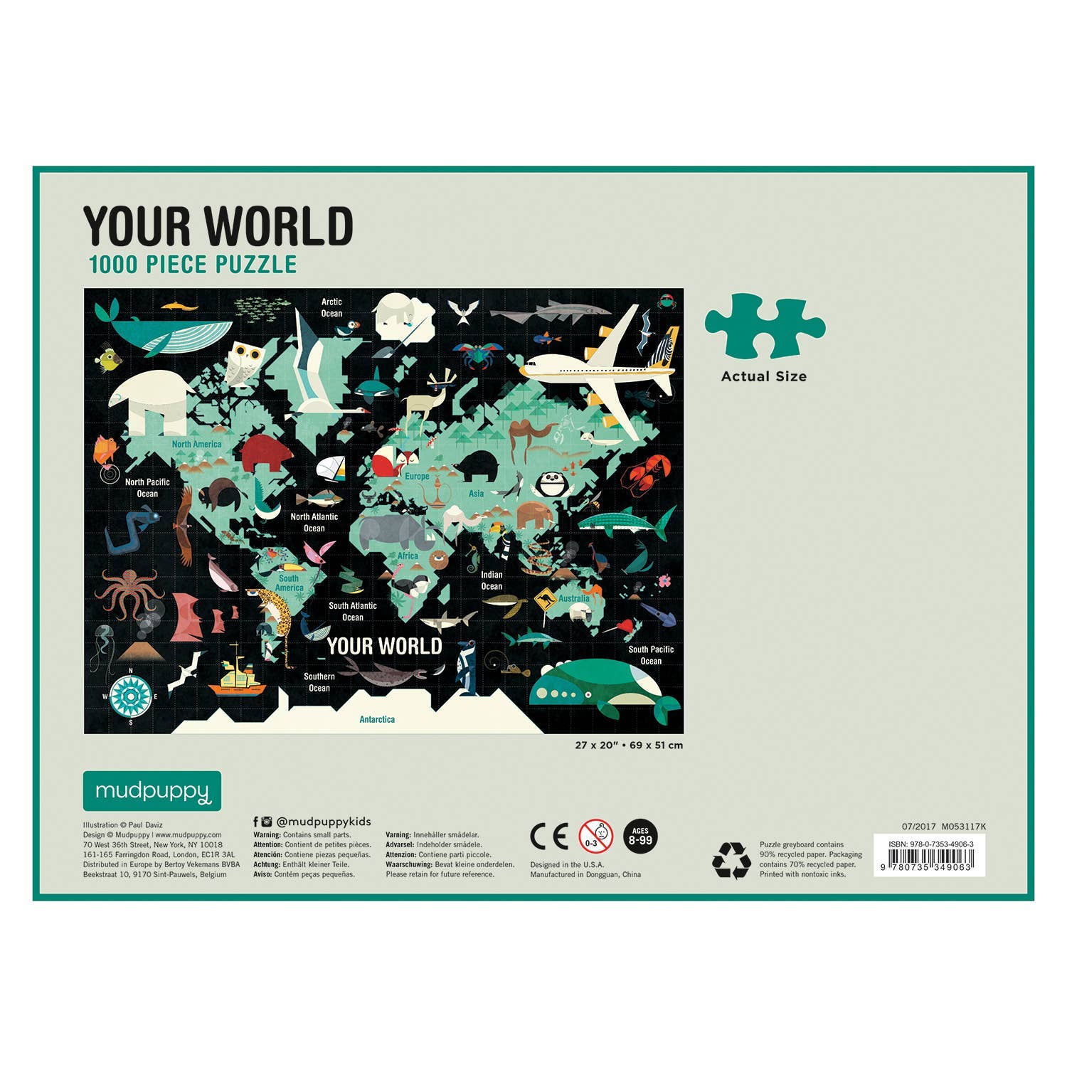 Put together this 1000 piece family puzzle from Mudpuppy to reveal: "Your World." The completed puzzle features a vibrant and playful assortment of animals on a world map. The pieces come packaged in a sturdy box, perfect for gifting, reuse, and storage. This is a great family activity to enjoy together!